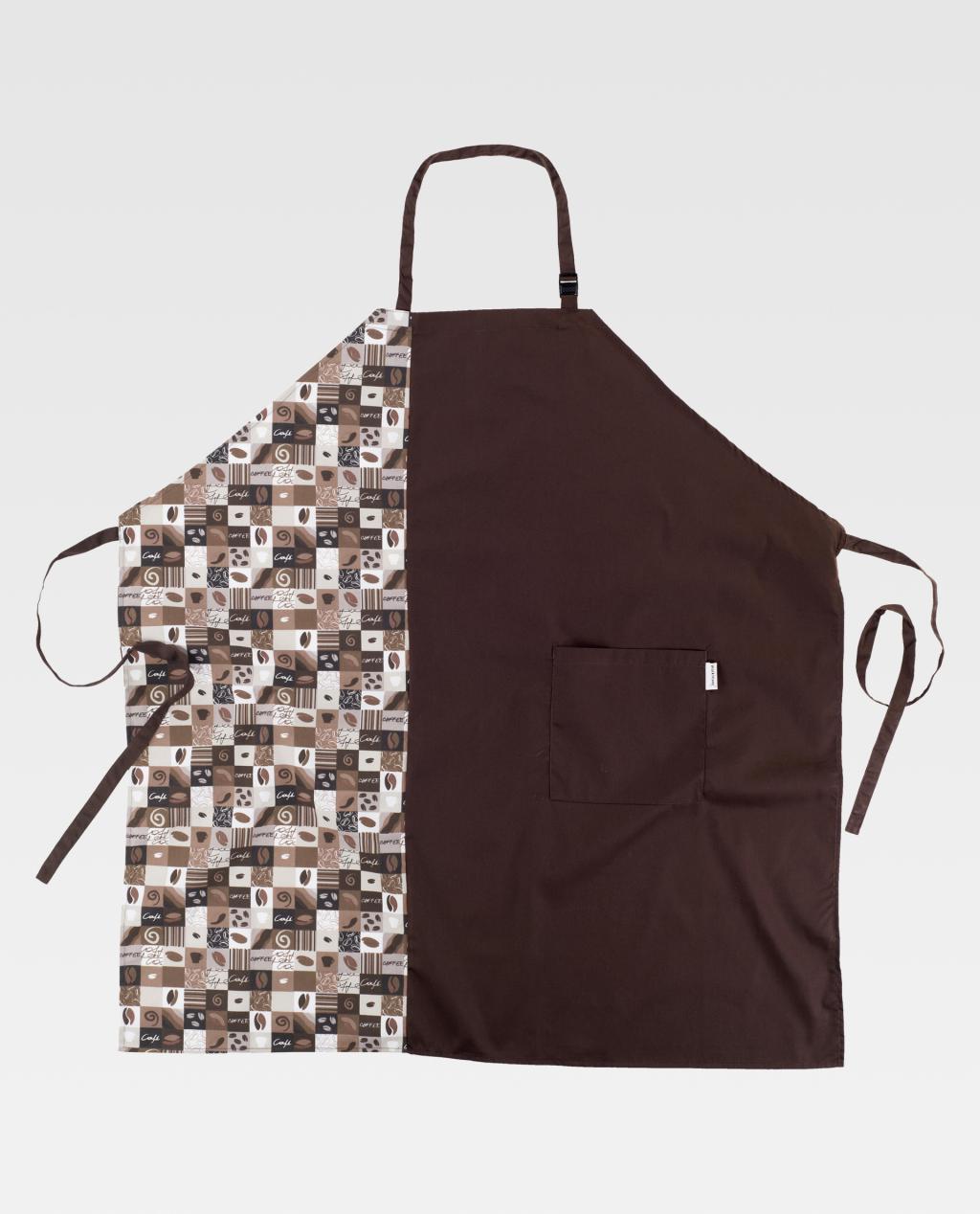 Avental combinado com peitilho. Um bolso lateral. Gola com fivela regulável. Cintas para ajustar na cintura. Acabado anti-nódoas. 90X95 cm.