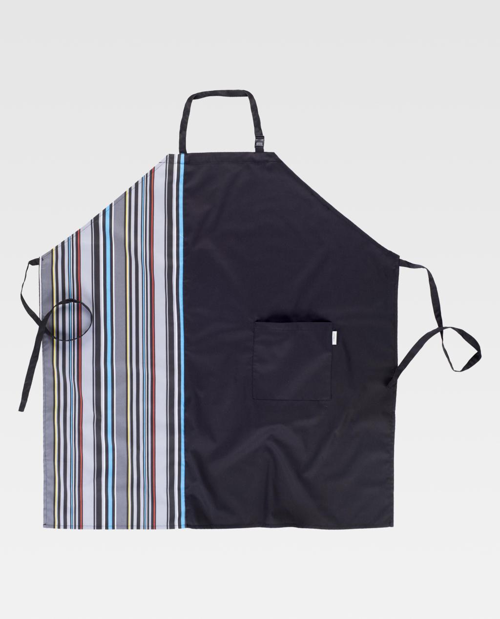 Avental combinado com peitilho. Um bolso lateral. Gola com fivela regulável. Cintas para ajustar na cintura. Acabado anti-nódoas. 90X95 cm.