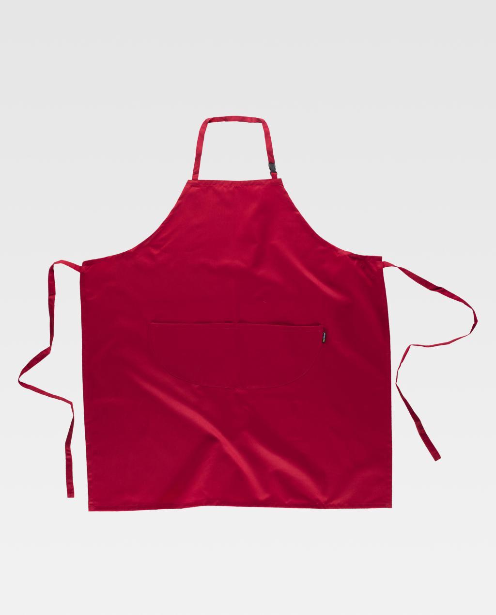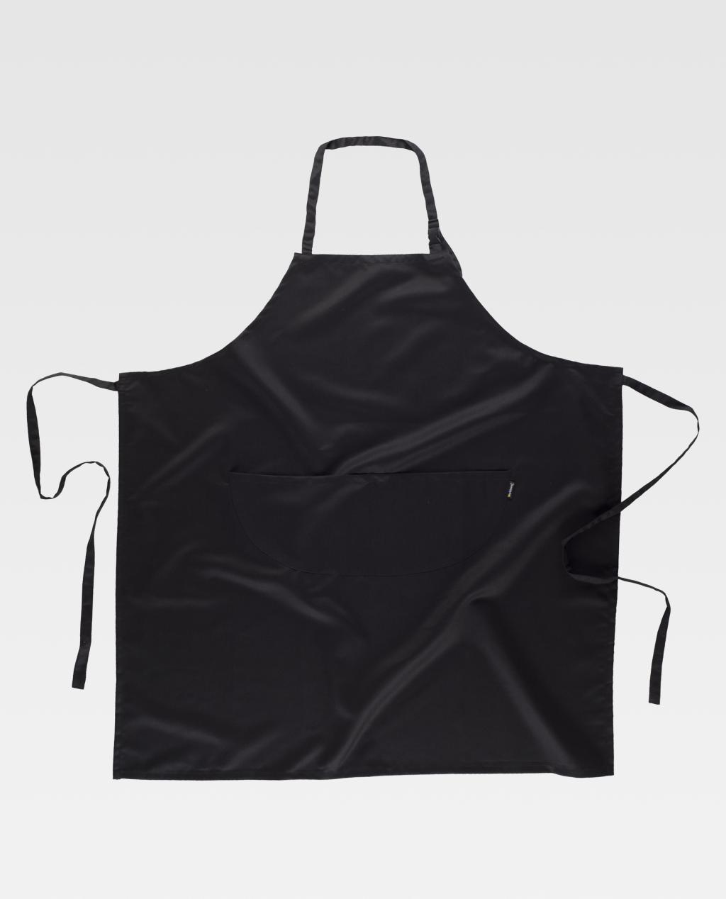Avental com peitilho. Um bolso arredondado central compartimentado. Gola com fivela regulável. Cintas para ajustar na cintura. 90X95 cm.