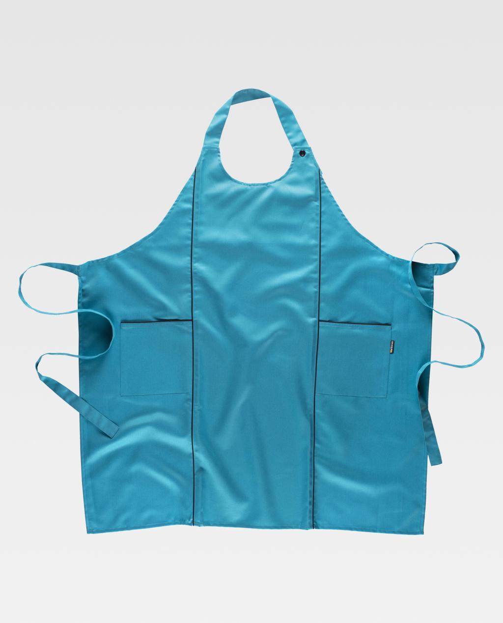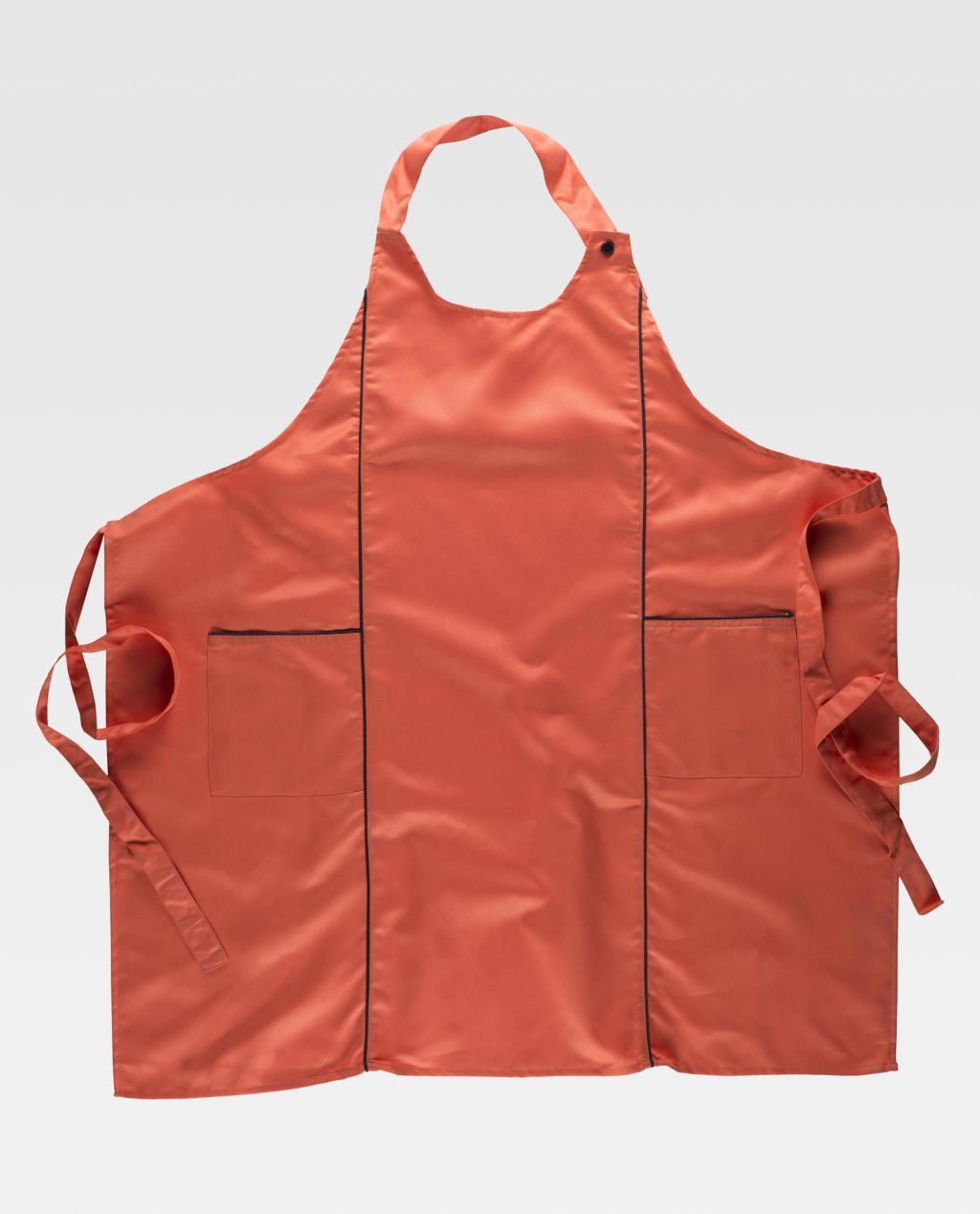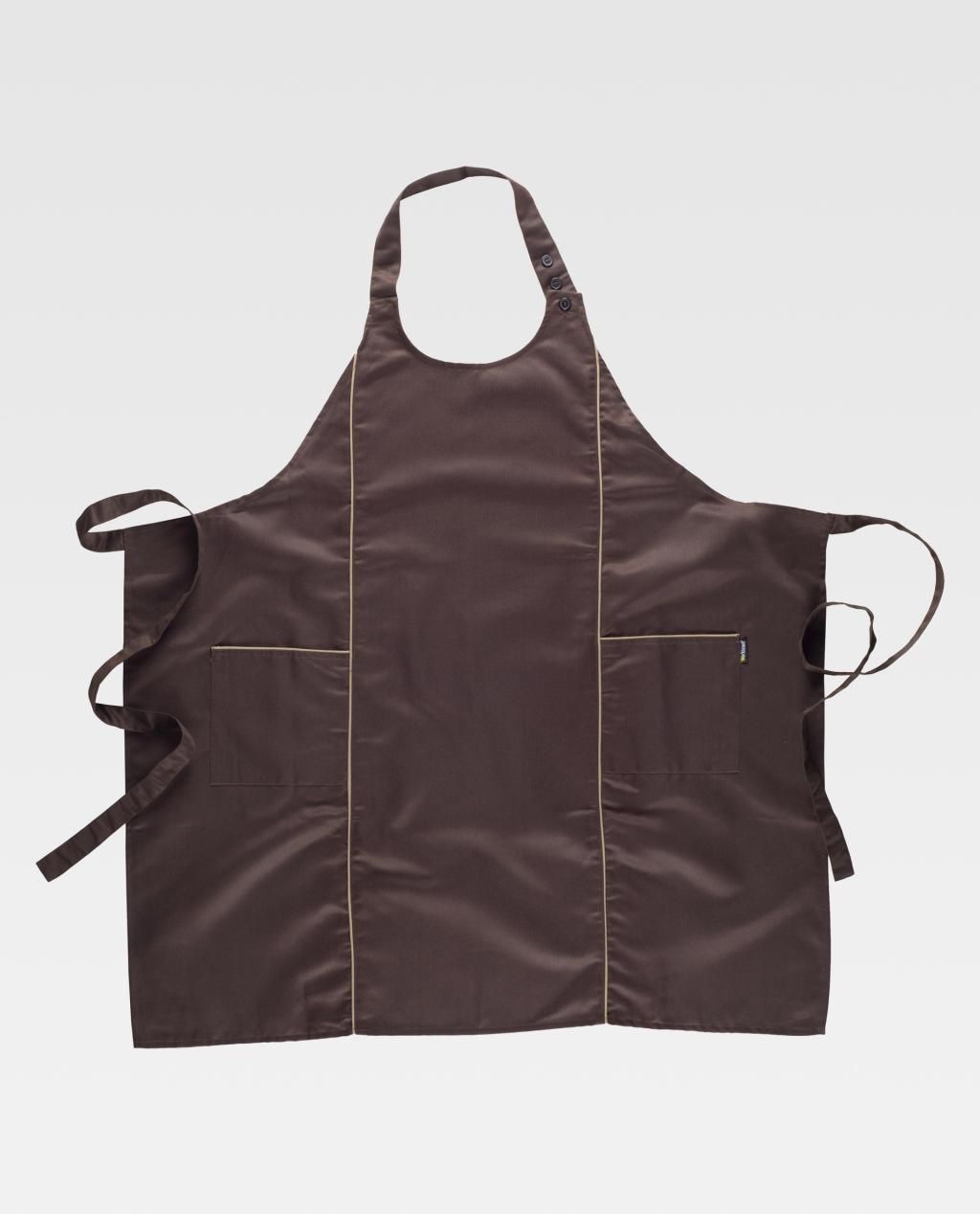 Avental combinado com peitilho. Dois bolsos laterais e cortes decorativos acabados com debruns em contraste. Gola regulável com botões. Cintas para ajustar na cintura. 90X90 cm.