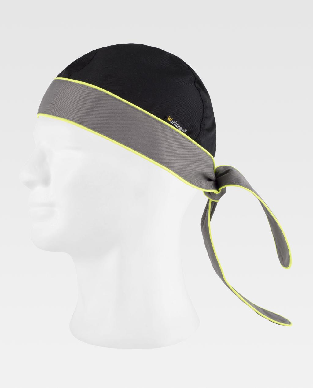 Bandana combinada com fita grossa para ajustar na nuca. Acabada com debruns de alta visibiliade. Acabado anti-nódoas.