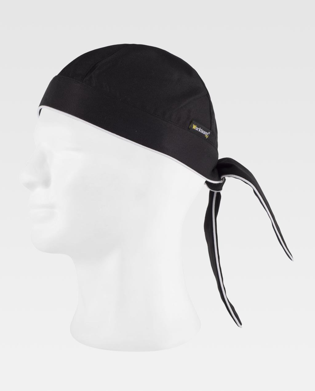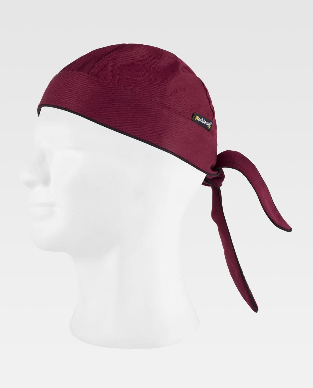 Bandana com fita grossa para ajustar na nuca acabada com debruns em contraste.
