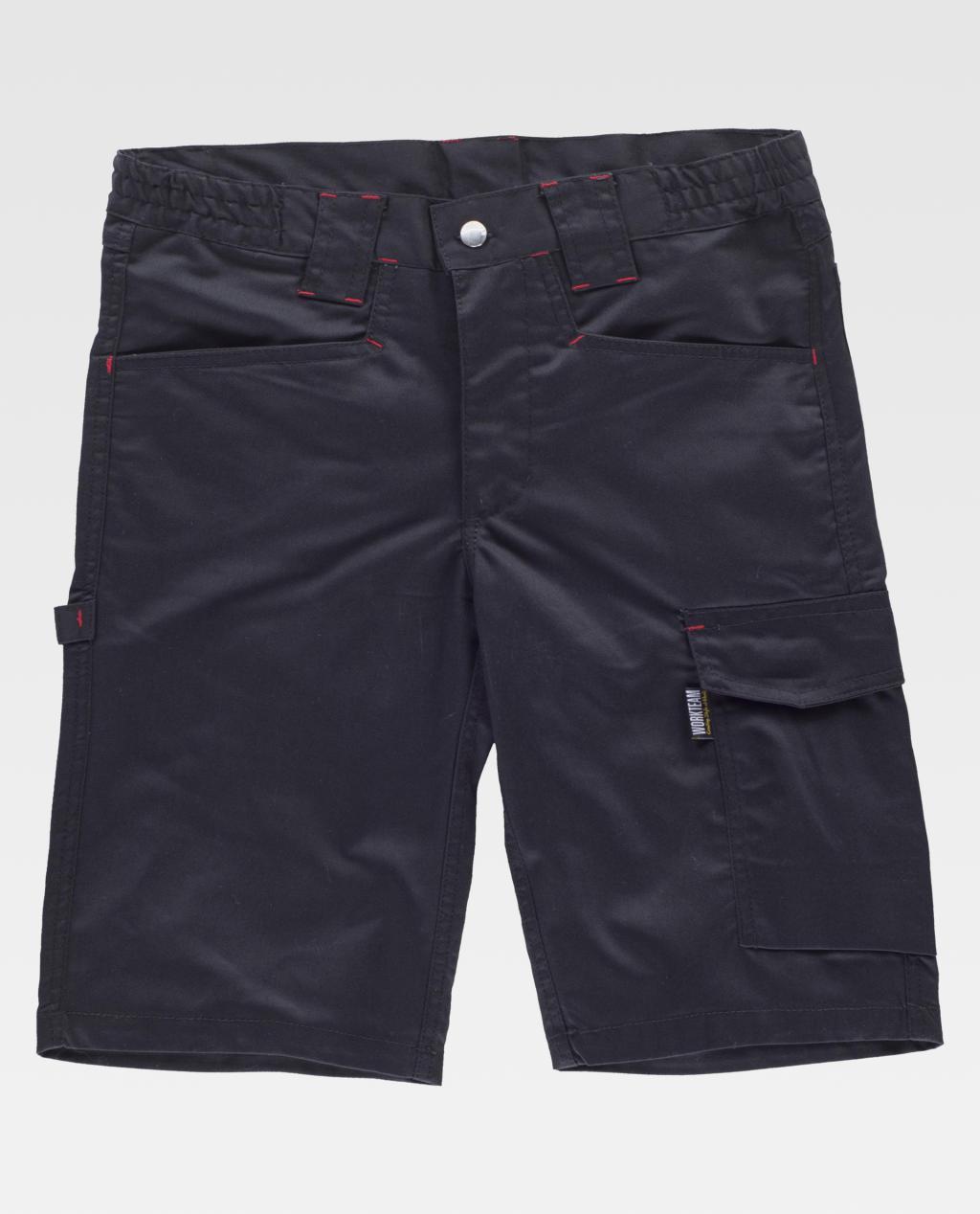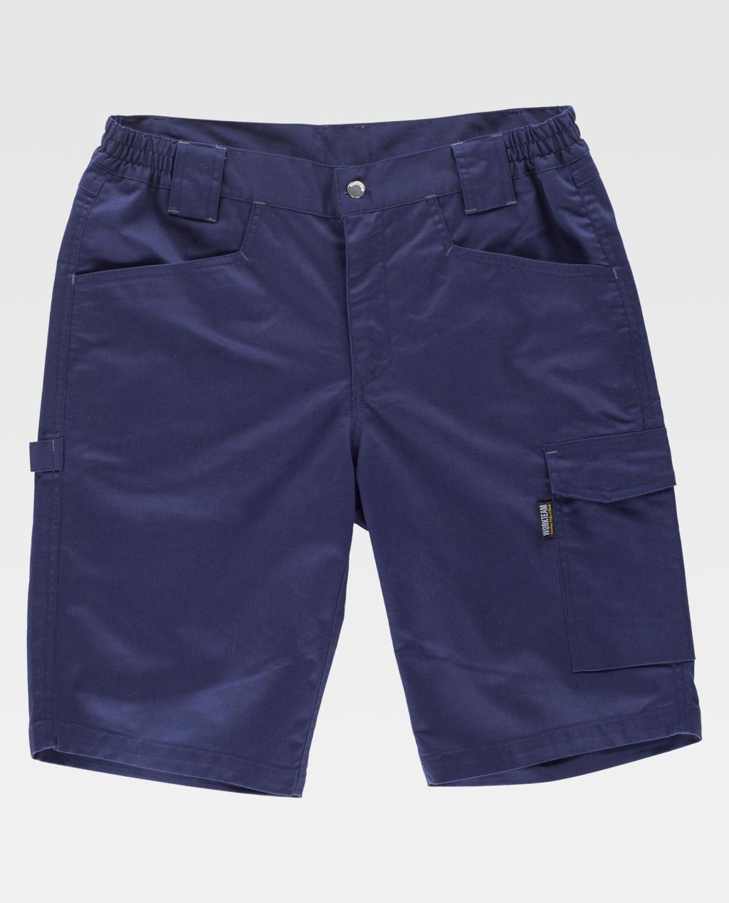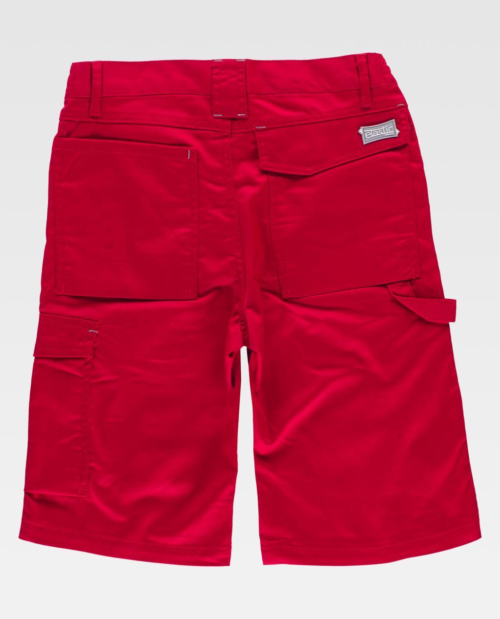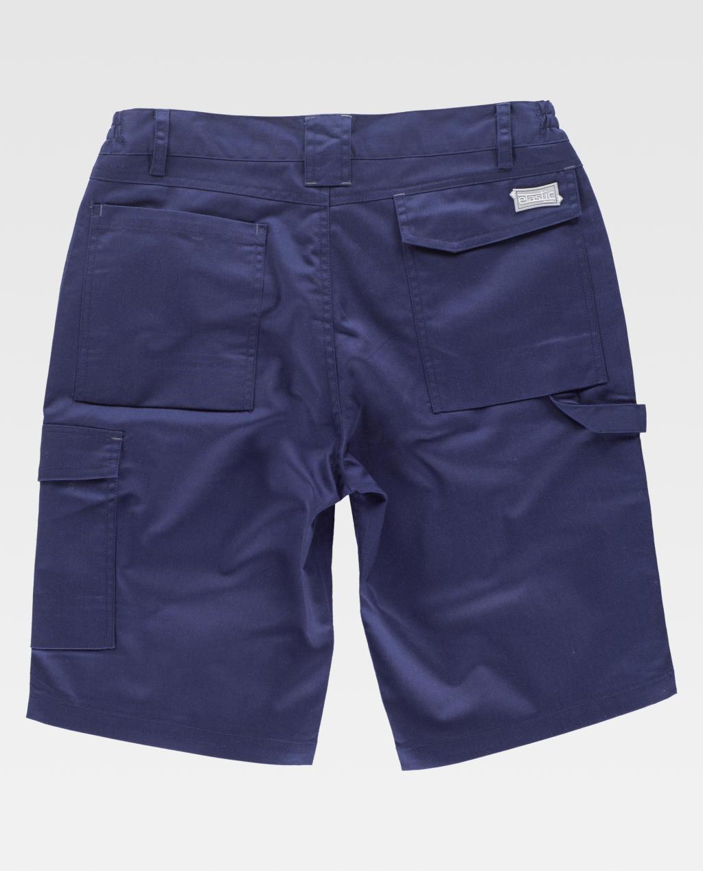 Bermuda de tecido elástico bidireccional por construção. Dois bolsos de abertura inclinada nos costados e um bolso lateral com pregue inferior e lapela de velcro. Dois bolsos traseiros com pregue inferior, um com lapela de velcro e um bolso de espátula. Passador porta martelo. Presilhas em contraste. Elástico nos laterais da cintura. Passadores de diferentes tamanhos. Fecho de botão metálico e braguilha de fecho de correr.