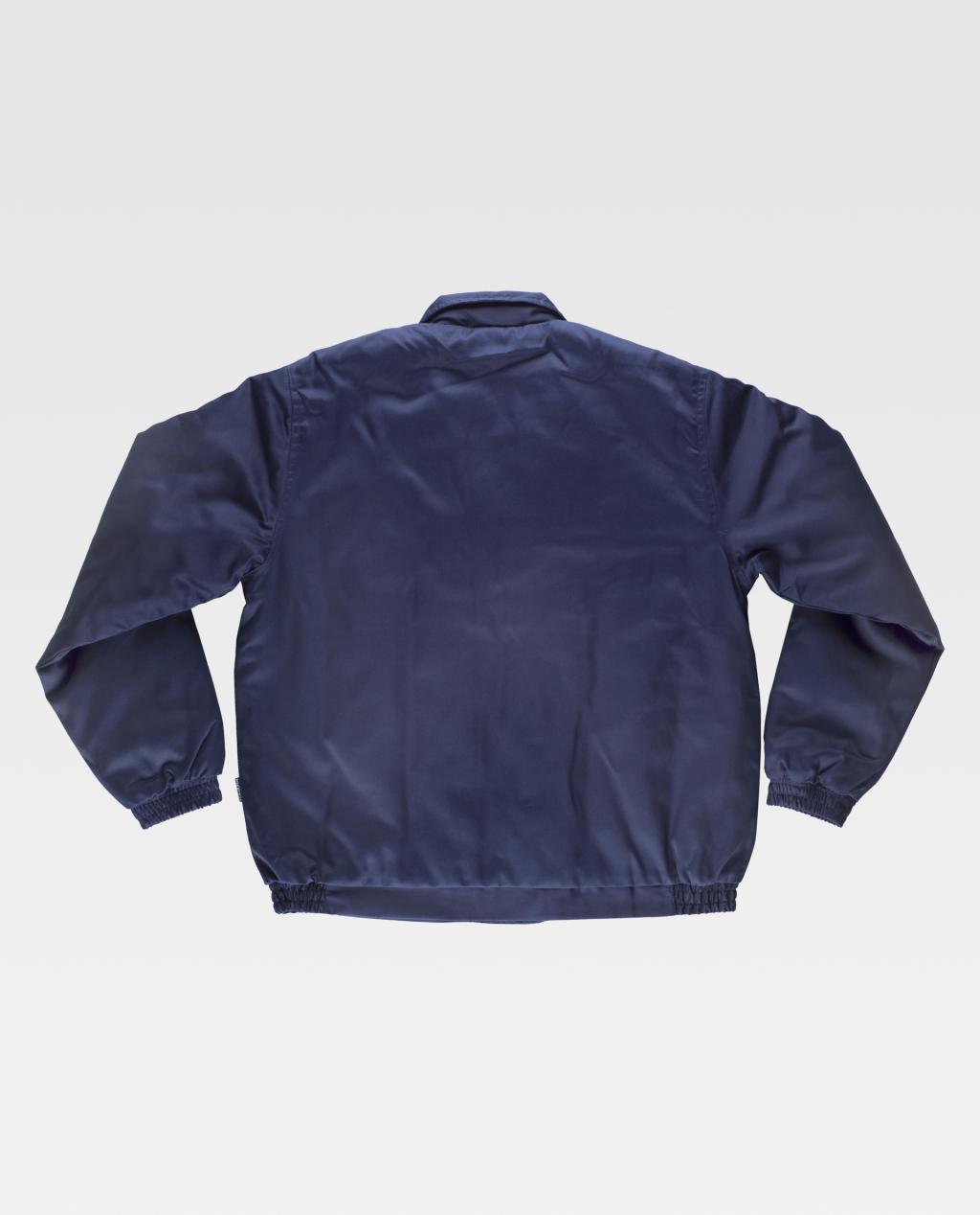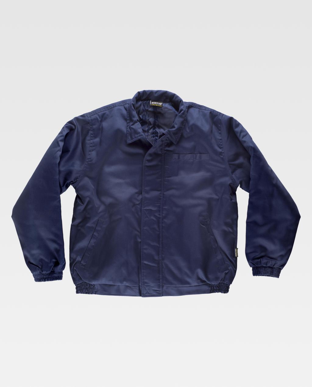 Blusão para o frio com forro acolchoado. Gola tipo camiseiro, Fecho de correr de náilon oculto por aba postiza com velcro. Um bolso no peito e dois bolsos laterais semi-embutidos. Um bolso de chapa no peito com fecho de velcro no interior. Punho com elástico. Elástico no laterais da cintura.