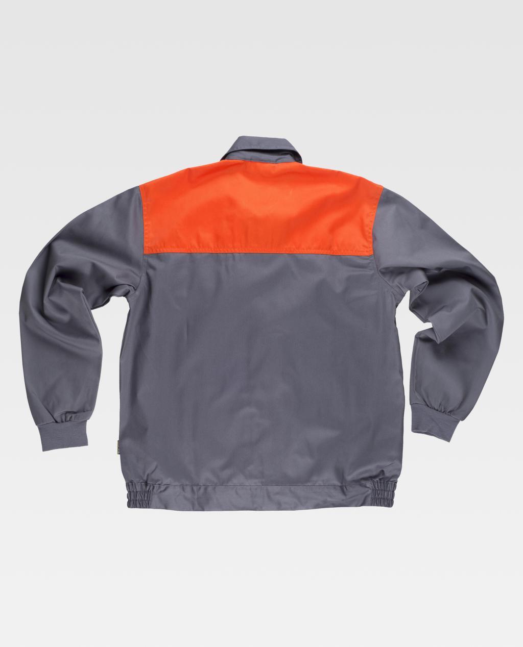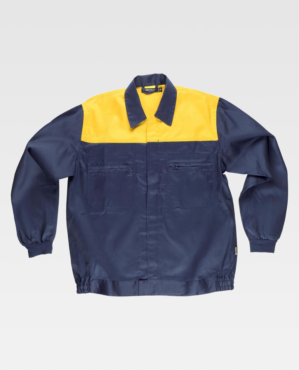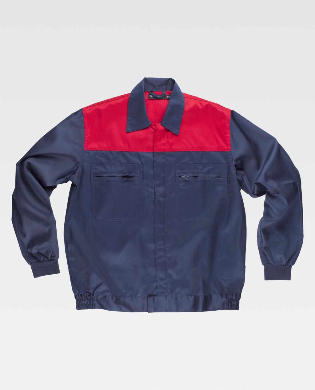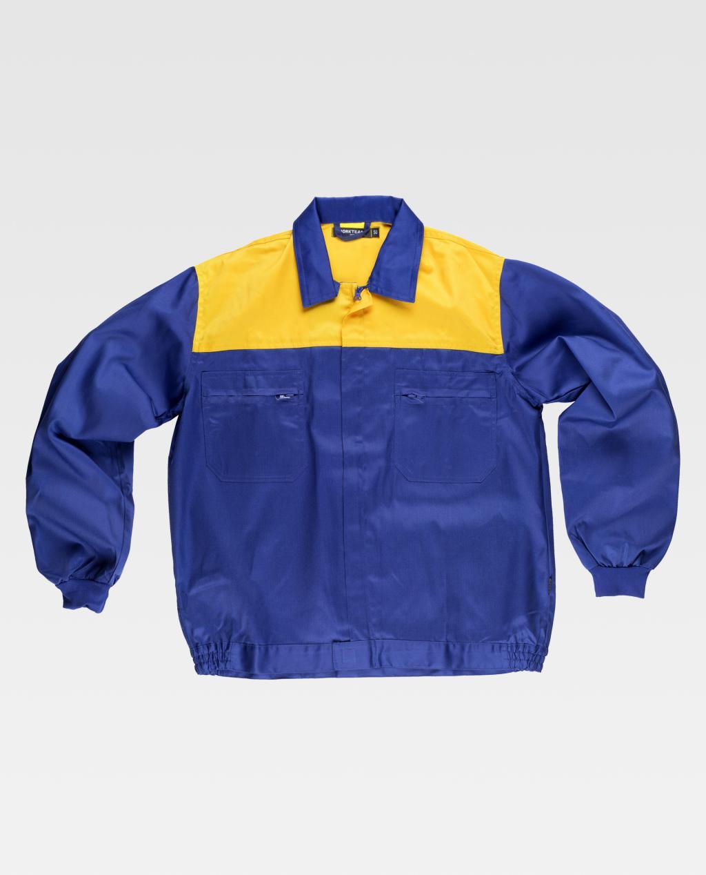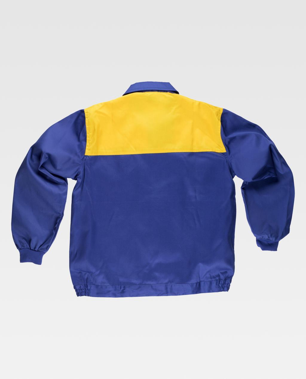 Blusão com corpetes combinados. Gola tipo camiseiro e fecho de correr de náilon oculto. Dois bolsos de chapa no peito com fecho de correr de náilon. Punho elástico. Fecho de velcro na cintura e elástico nos laterais.