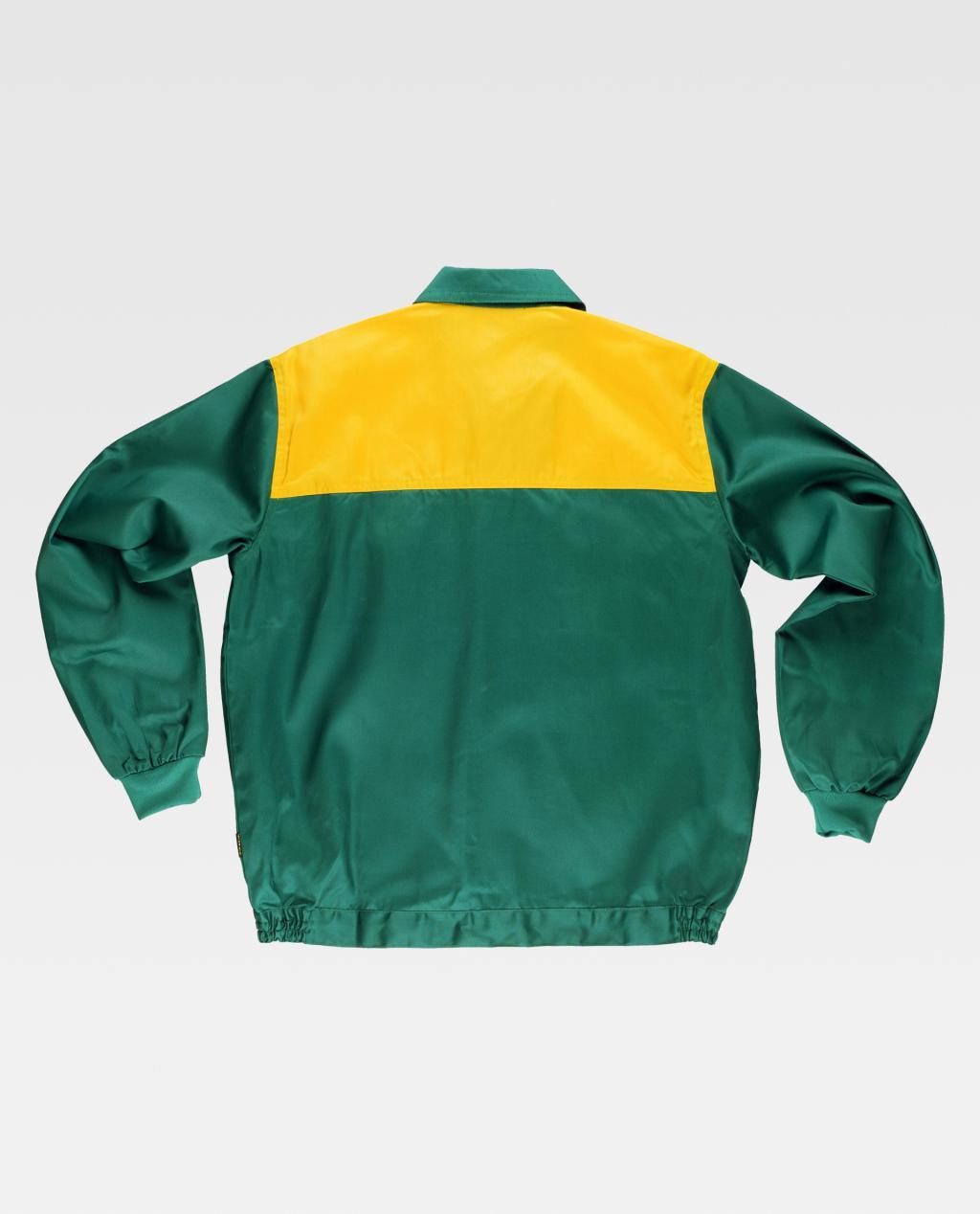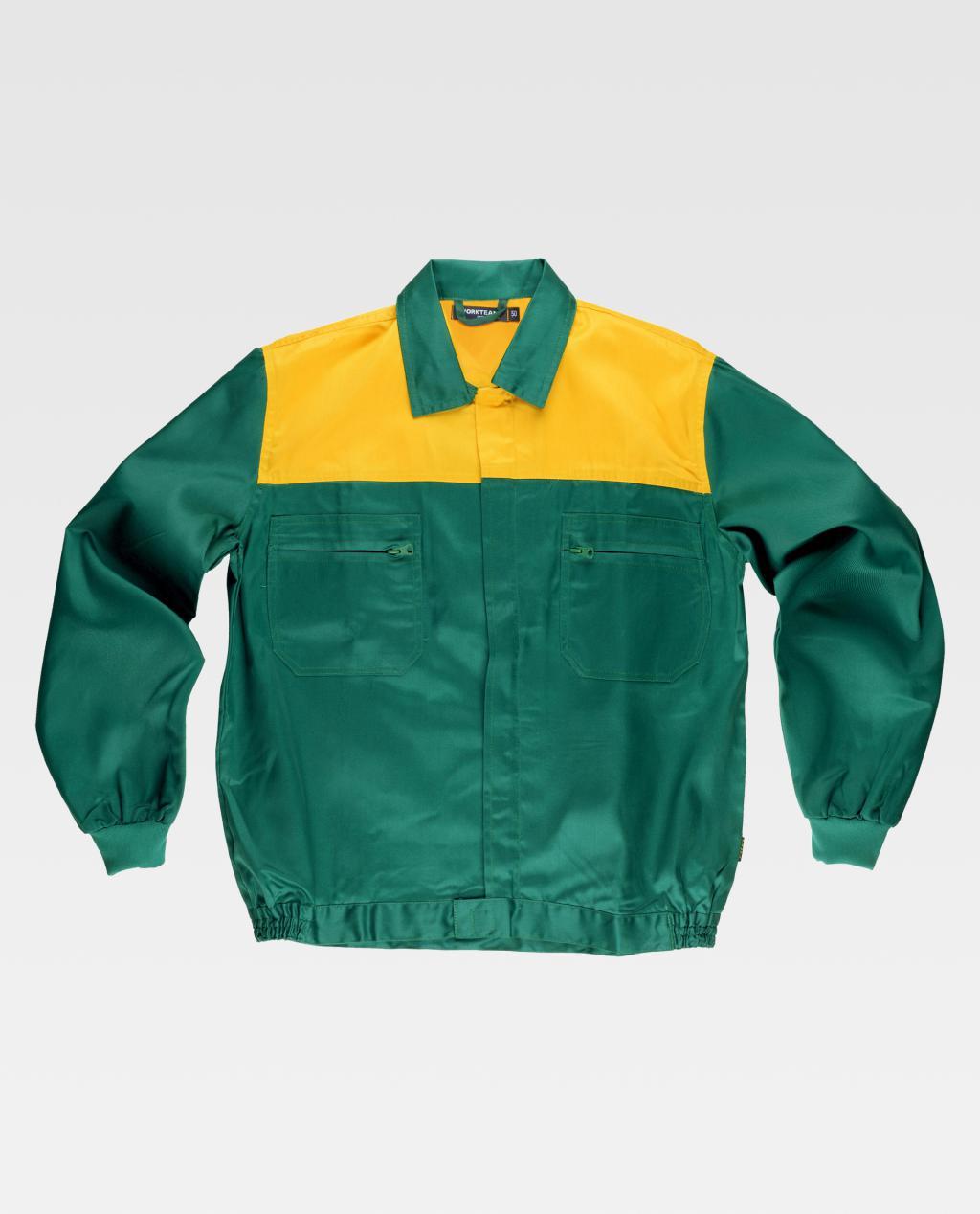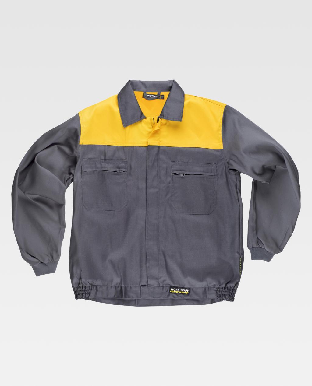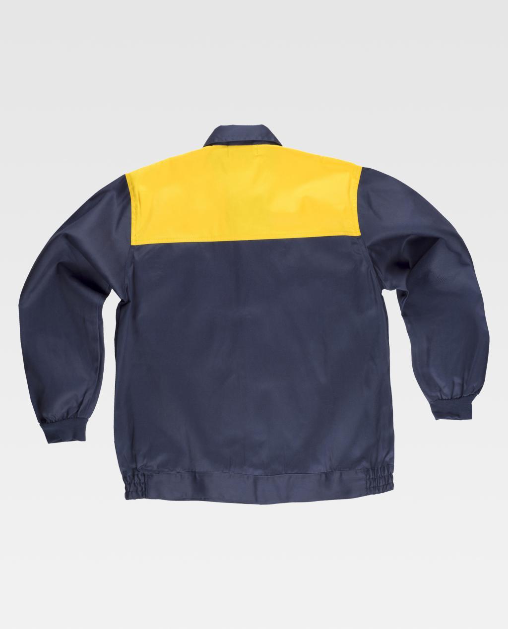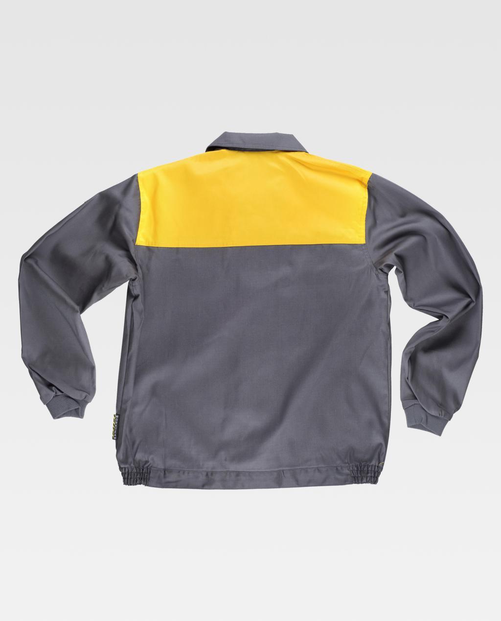 Blusão com corpetes combinados. Gola tipo camiseiro e fecho de correr de náilon oculto. Dois bolsos de chapa no peito com fecho de correr de náilon. Punho elástico. Fecho de velcro na cintura e elástico nos laterais.