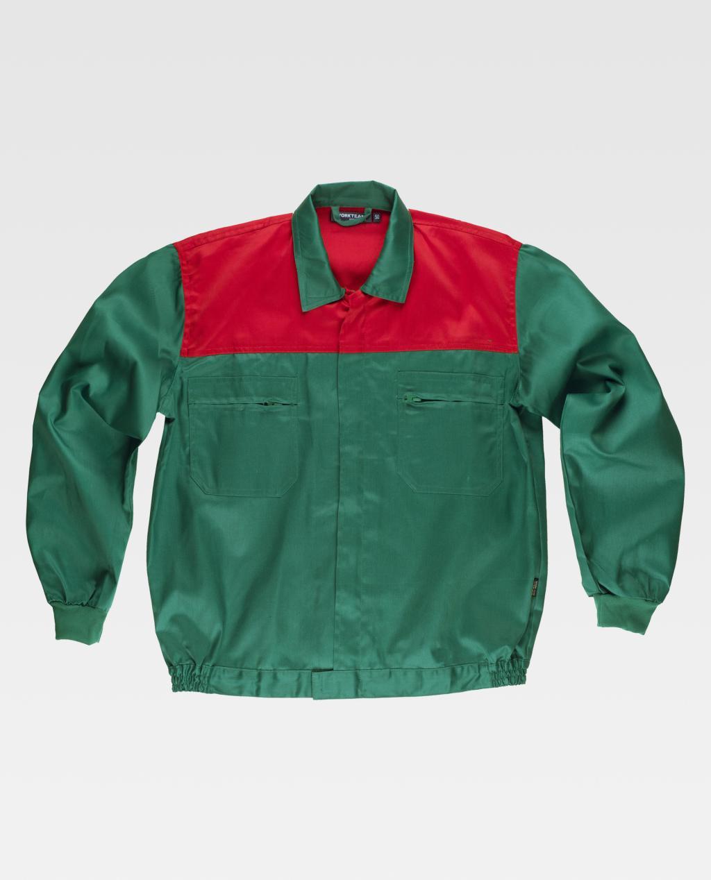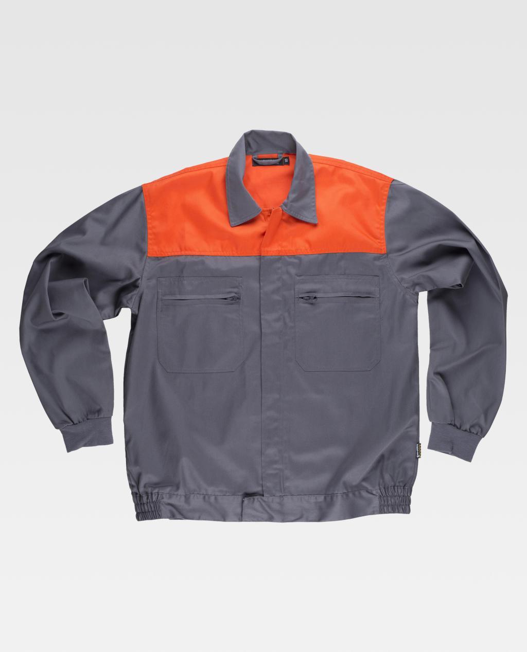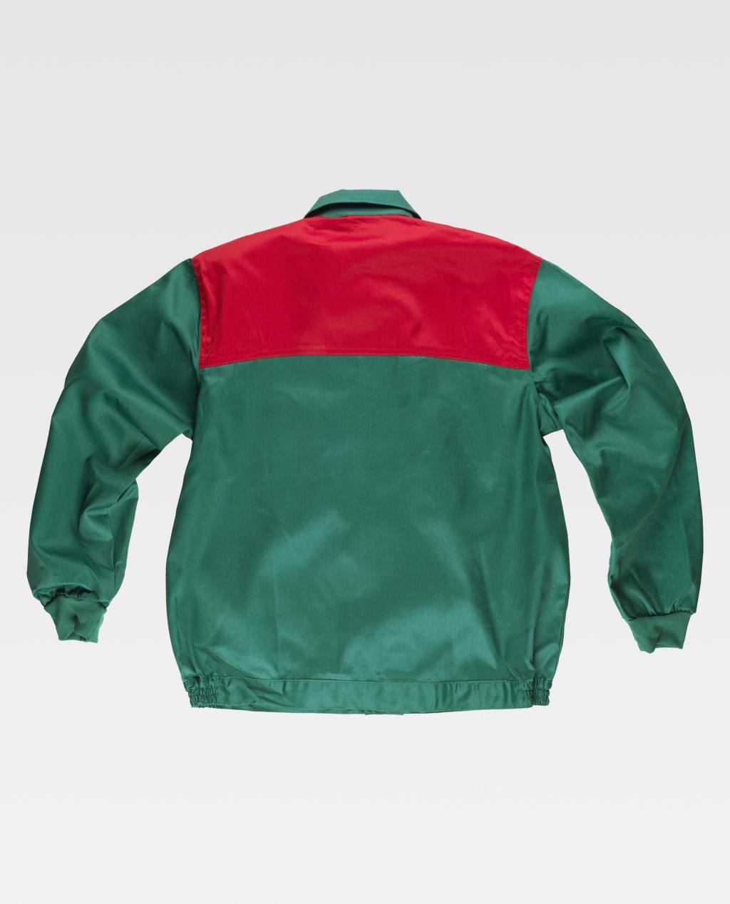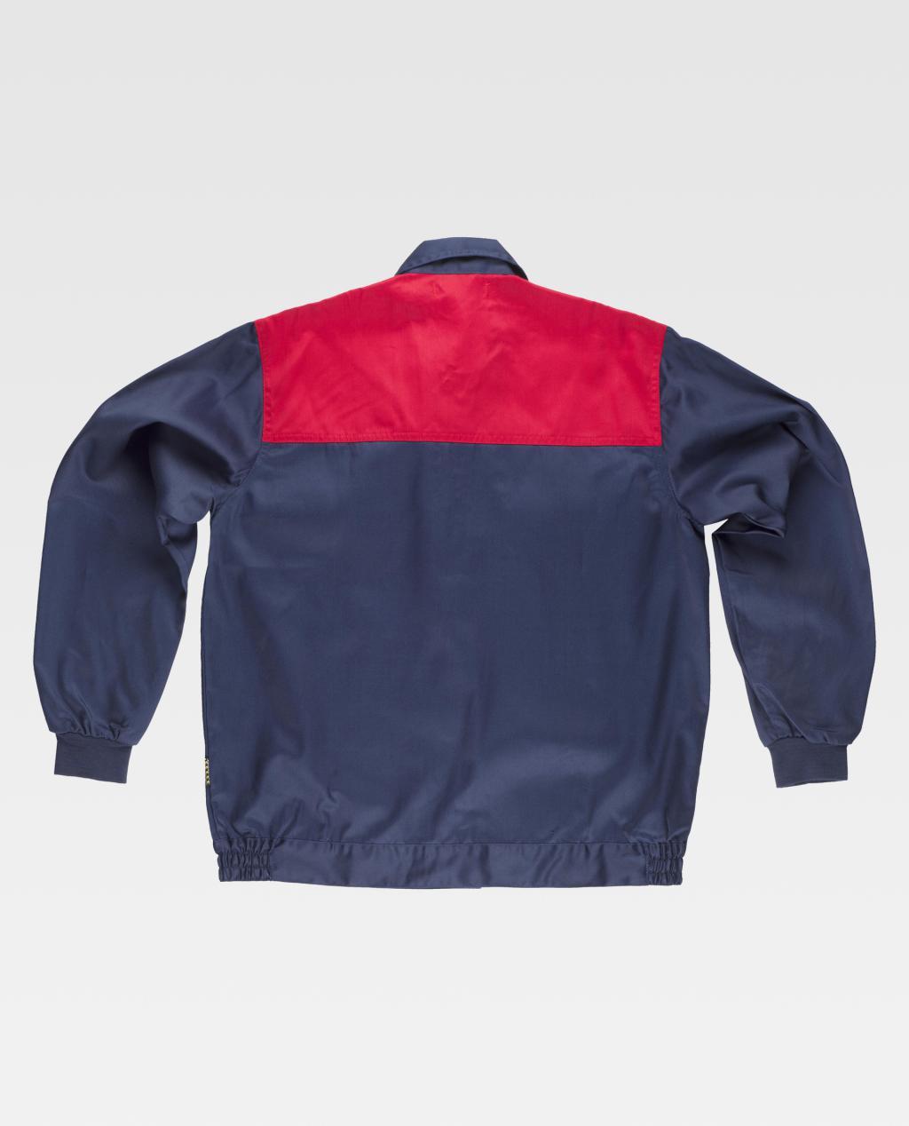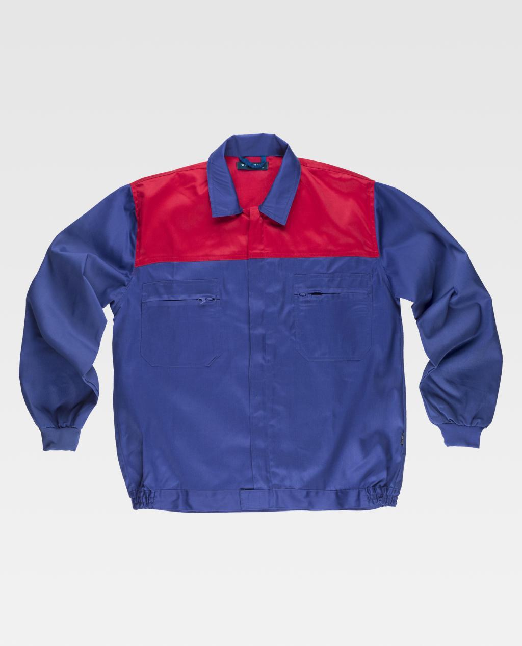 Blusão com corpetes combinados. Gola tipo camiseiro e fecho de correr de náilon oculto. Dois bolsos de chapa no peito com fecho de correr de náilon. Punho elástico. Fecho de velcro na cintura e elástico nos laterais.