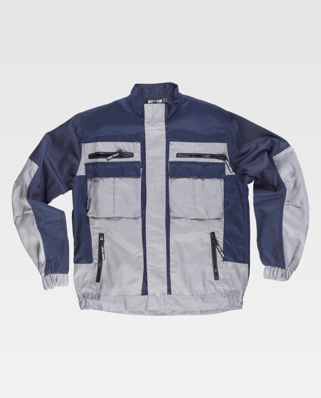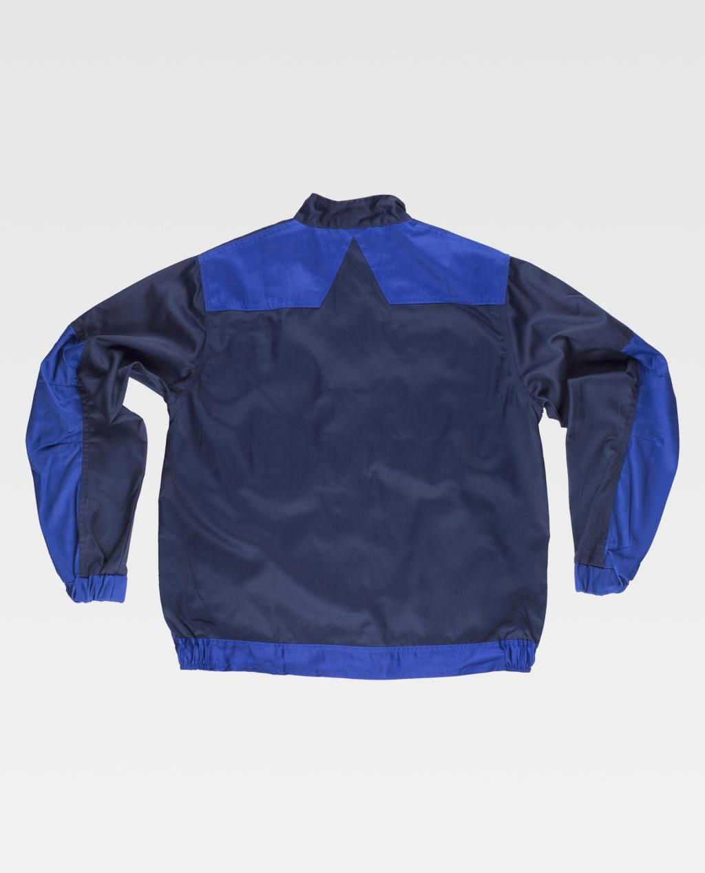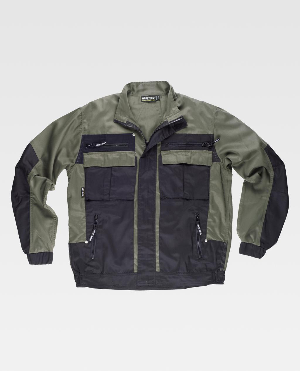 Blusão combinado com costura tripla e corpete nas costas. Gola alta e fecho de correr de náilon oculto por aba com velcro. Dois bolsos no peito interiores com fecho de correr e dois bolsos duplos com fole e lapela de velcro. Dois bolsos laterais interiores com fecho de correr. Mangas combinadas. Punho com elástico. Elástico nos laterais da cintura.