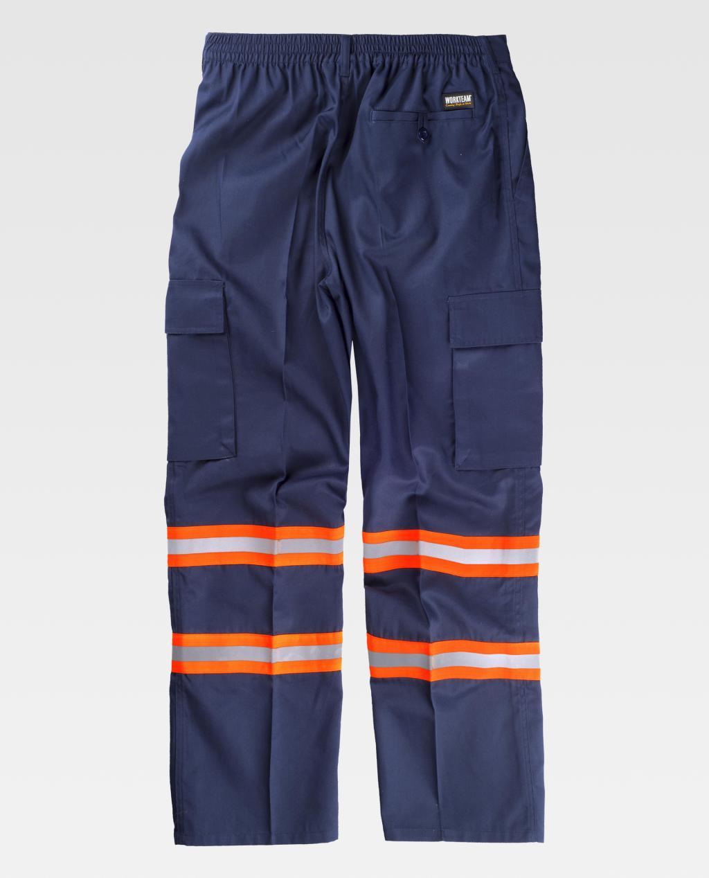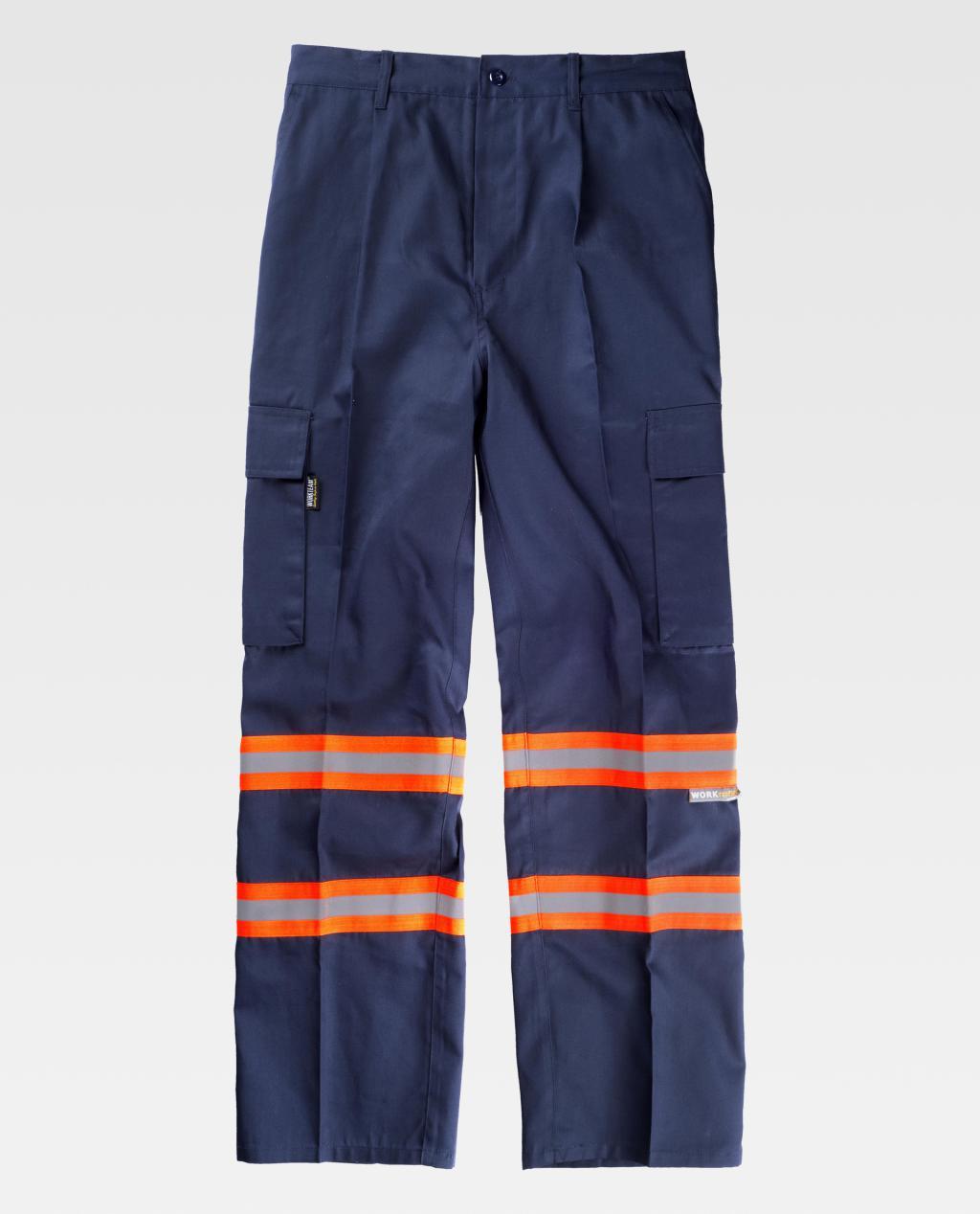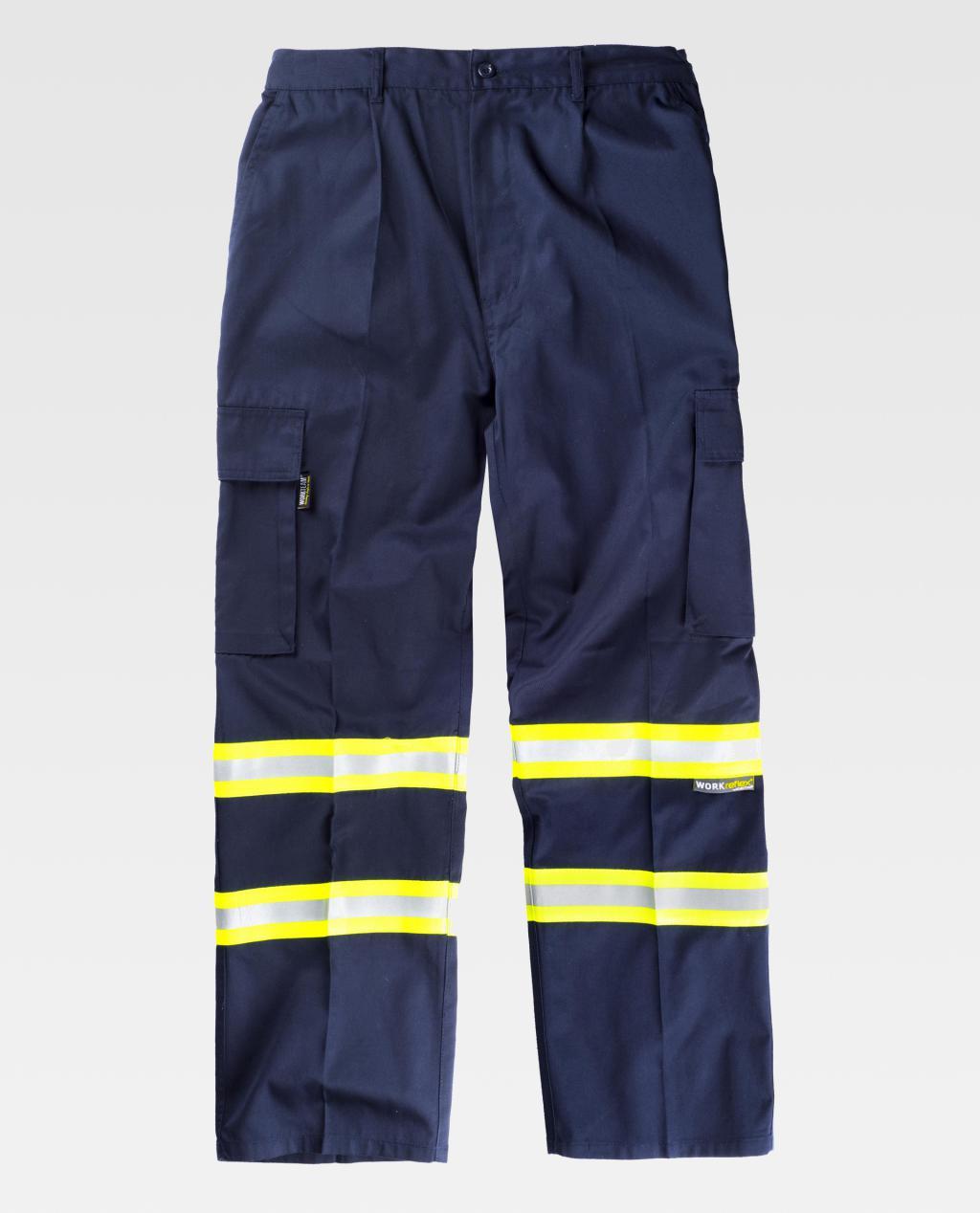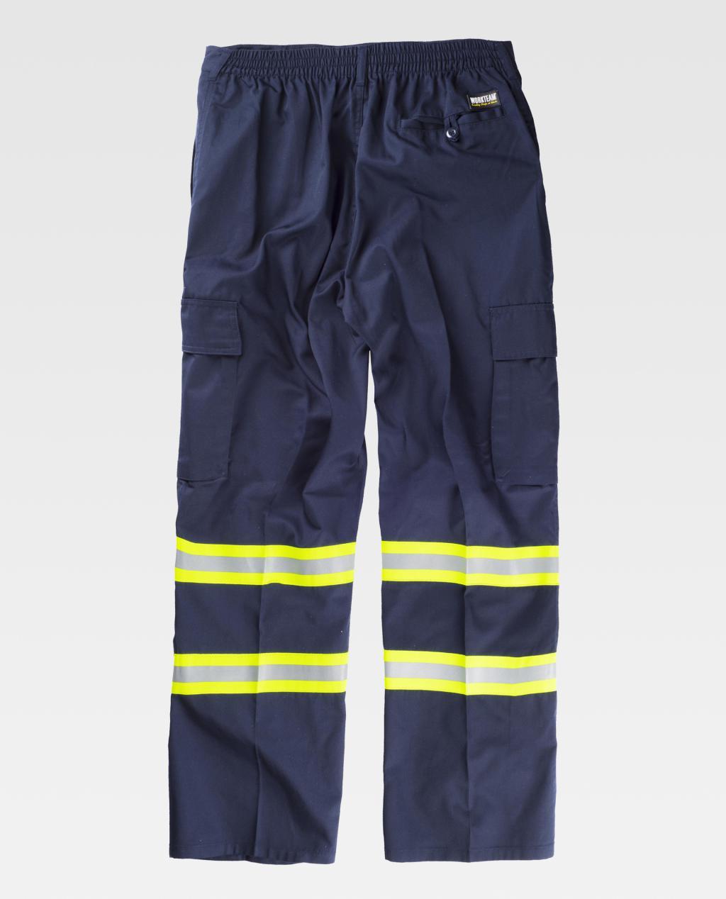 Calça direita com fitas refletoras-fluorescentes. Dois bolsos de abertura inclinada nos costados, dois bolsos cargo laterais com lapela de velcro. Um bolso semi-embutido traseiro com fecho de presilha e botão. Duas fitas fluorescentes com uma fita refletora nas perneiras. Elástico na cintura. Passadores. Fecho de botão e braguilha de fecho correr.