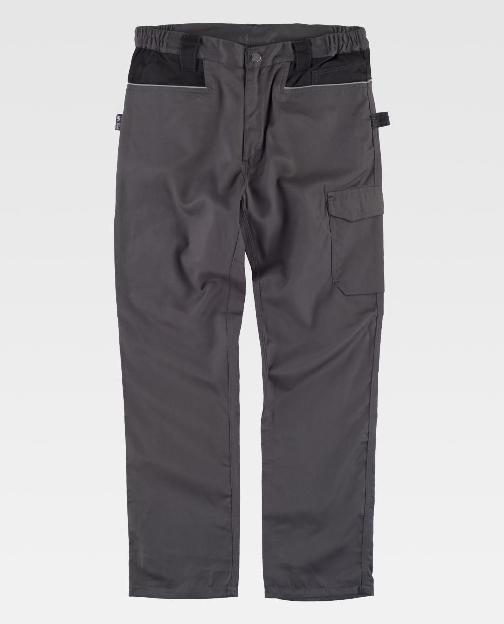 Calça combinada com reforços e costura tripla. Dois bolsos de abertura inclinada nos costados, um bolso relojoeiro e um bolso cargo lateral com lapela de velcro. Dois bolsos traseiros com prega no baixo, um com lapela de velcro e um bolso de espátula. Passador porta martelo. Reforço no assento. Debruns reflectores e presilhas em contraste. Elástico nos laterais da cintura. Passadores. Fecho de botão metálico e braguilha de fecho de correr.