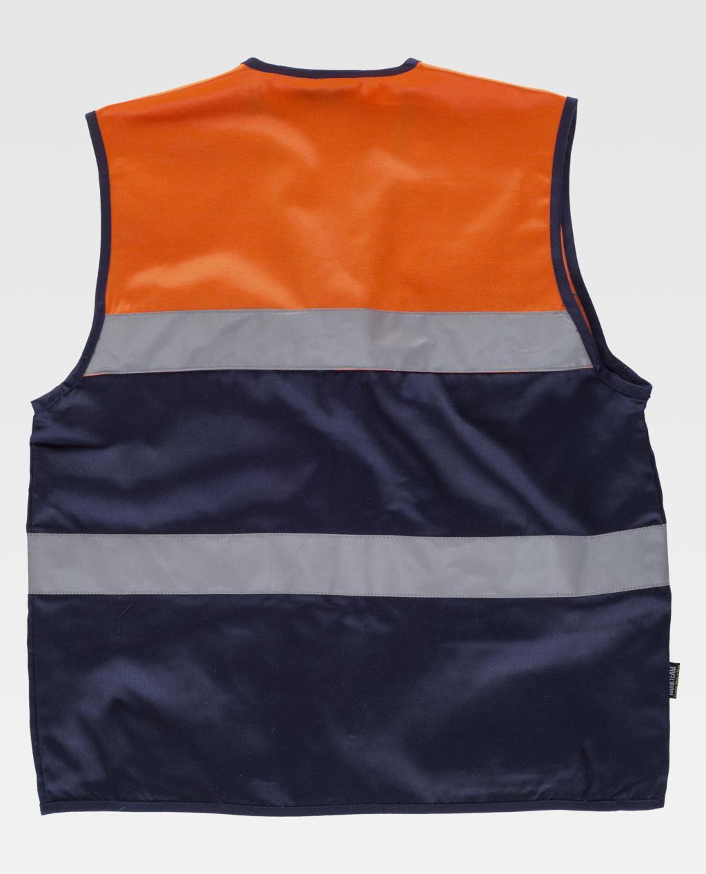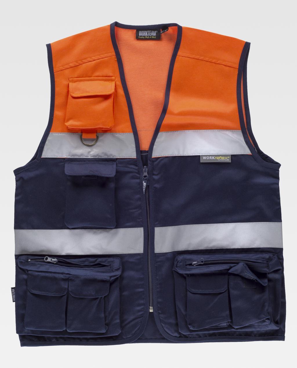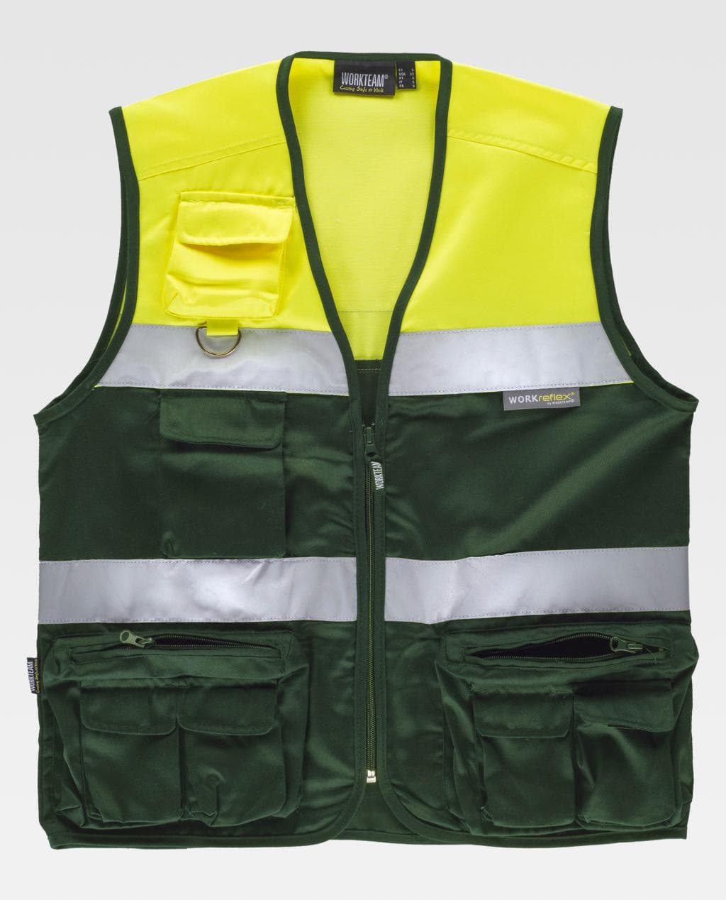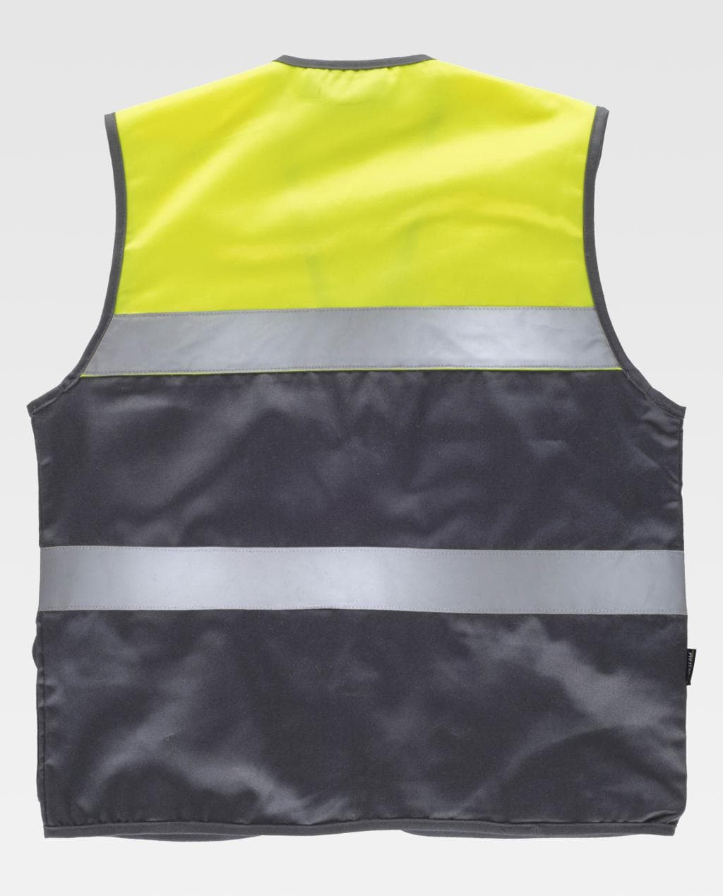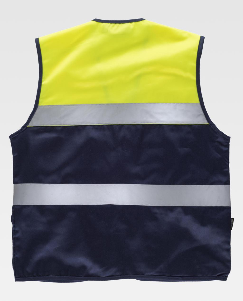 Colete tipo safari combinado com fitas refletoras. Parte superior de alta visibilidade. Decote em bico e fecho de correr de náilon. Dois bolsos no peito de diferentes tamanhos com fole e lapela de velcro. Argola metálica no bolso superior. Dois bolsos laterais com fole e fecho de correr. Bolsos auxiliares sobrepostos com lapela de velcro. Duas fitas refletoras no peito e nas costas. Acabado com bainhas.