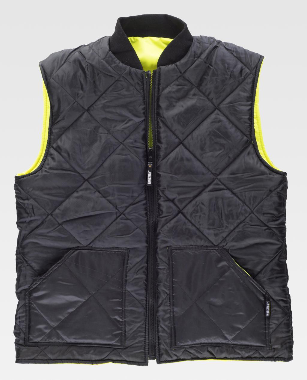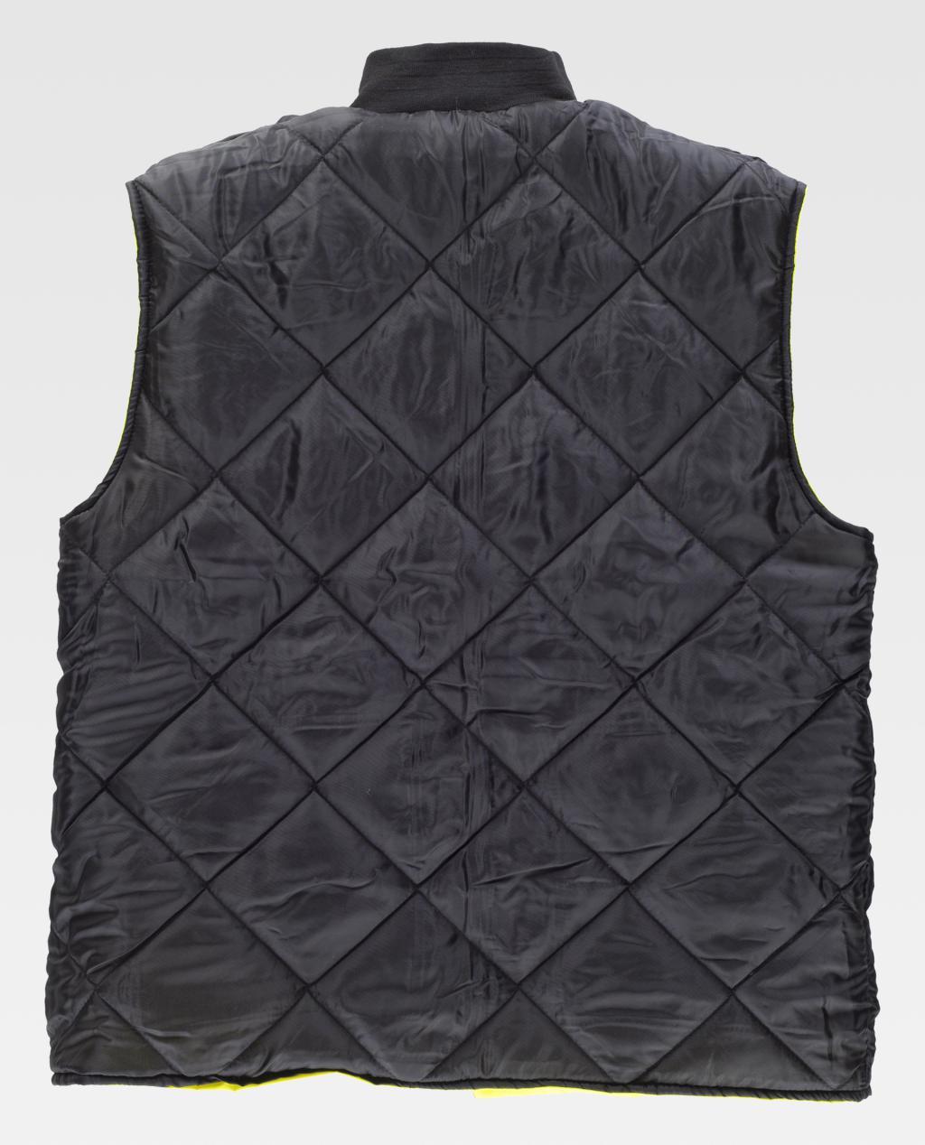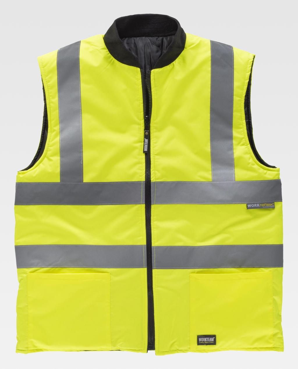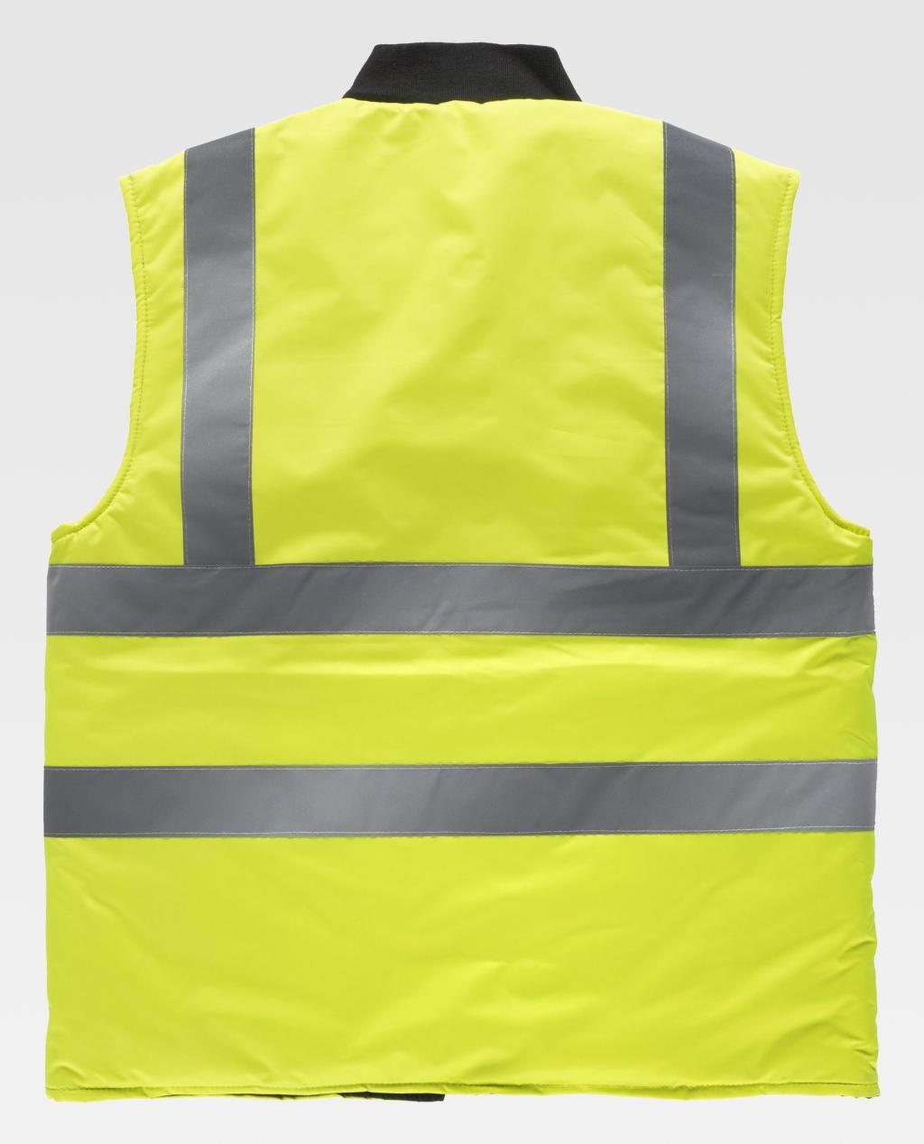 Colete reversível, acolchoado, de alta visibilidade em tecido Oxford com fitas refletoras. Gola mao em ponto elástico e fecho de correr de náilon em contraste. Dois bolsos laterais de chapa. Uma fita refletora nos ombros e duas no peito e nas costas. Interior acolchoado pespontado em rombos com dois bolsos laterais de chapa de abertura inclinada.