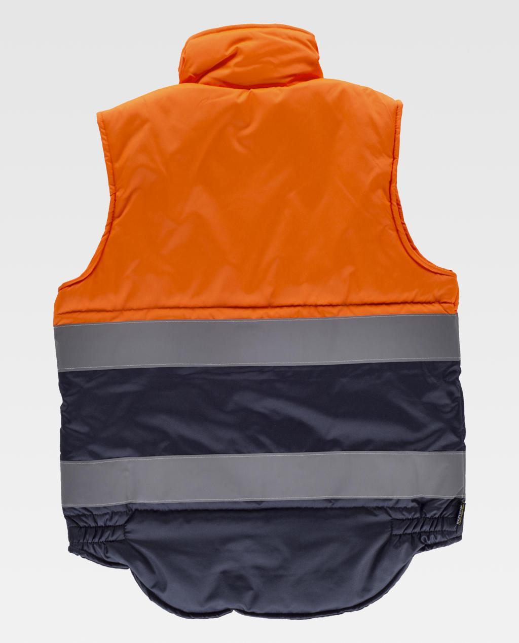 Colete acolchoado combinado em tecido Oxford com fitas refletoras. Parte superior de alta visibilidade. Gola alta e fecho de correr de náilon oculto por aba com presilhas. Um bolso no peito e dois laterais interiores com fecho de correr. Dois bolsos com fole e lapela de presilhas nos costados. Um bolso de chapa no peito com fecho de velcro no interior. Duas fitas refletoras no peito e nas costas. Cavas ajustáveis. Elástico nos laterais da cintura.