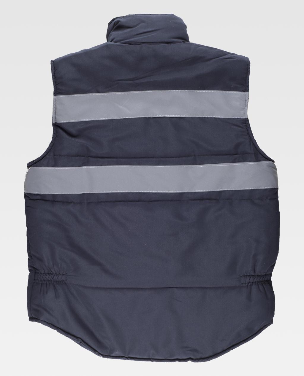 Colete acolchoado de gola alta com fitas refletoras. Fecho de correr de náilon oculto por aba de presilhas. Um bolso interior no peito com fecho de correr. Dois bolsos interiores com fecho de correr nos costados. Dois bolsos laterais com fole e lapela de presilhas. Um bolso de chapa no peito com fecho de velcro no interior. Duas fitas refletoras no peito e costas. Cavas ajustáveis. Elástico nos laterais da cintura.