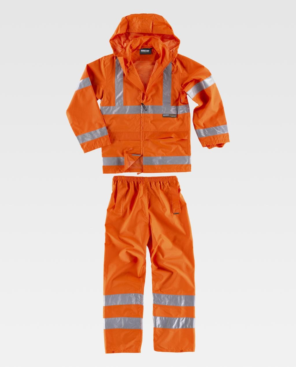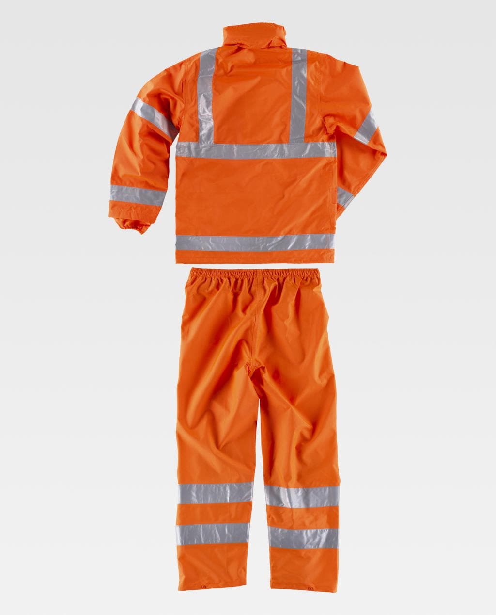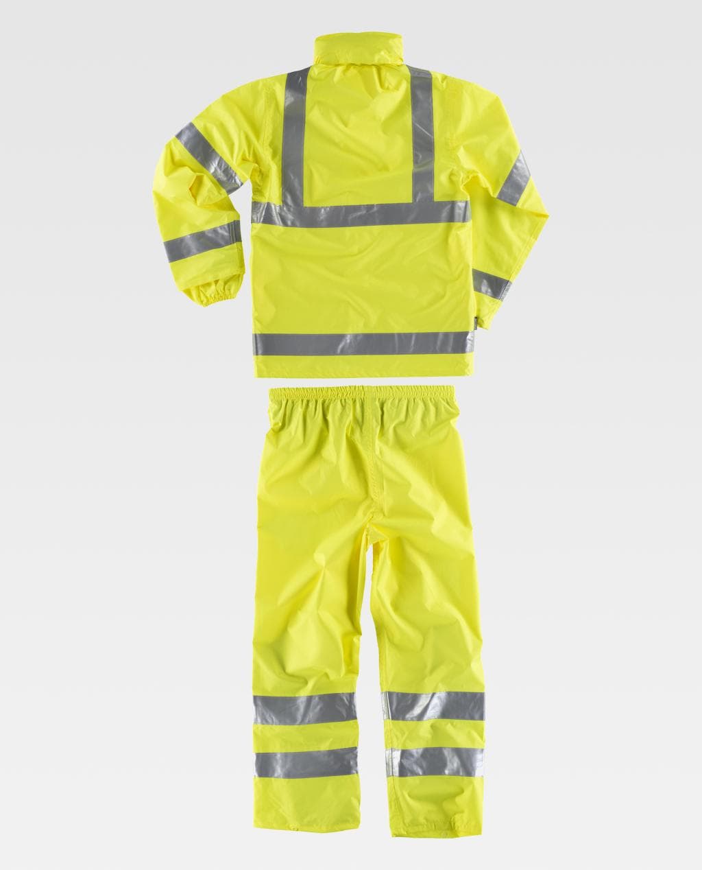 Fato de água impermeável, de alta visibilidade com fitas refletoras. Parte superior: Impermeável com fecho de correr de náilon. Gola alta com capuz interior ajustável com cordão. Dois bolsos laterais sobrepostos. Um bolso de chapa no peito com velcro no interior. Uma fita refletora nos ombros e duas no peito, nas costas e nas mangas. Punho elástico no interior da manga. Baixo ajustável com cordão. Revestido no interior. Parte inferior: Calça impermeável com cintura elástica. Duas fitas refletoras nas perneiras. Aberturas laterais de acesso no interior. Baixo ajustável com presilhas.