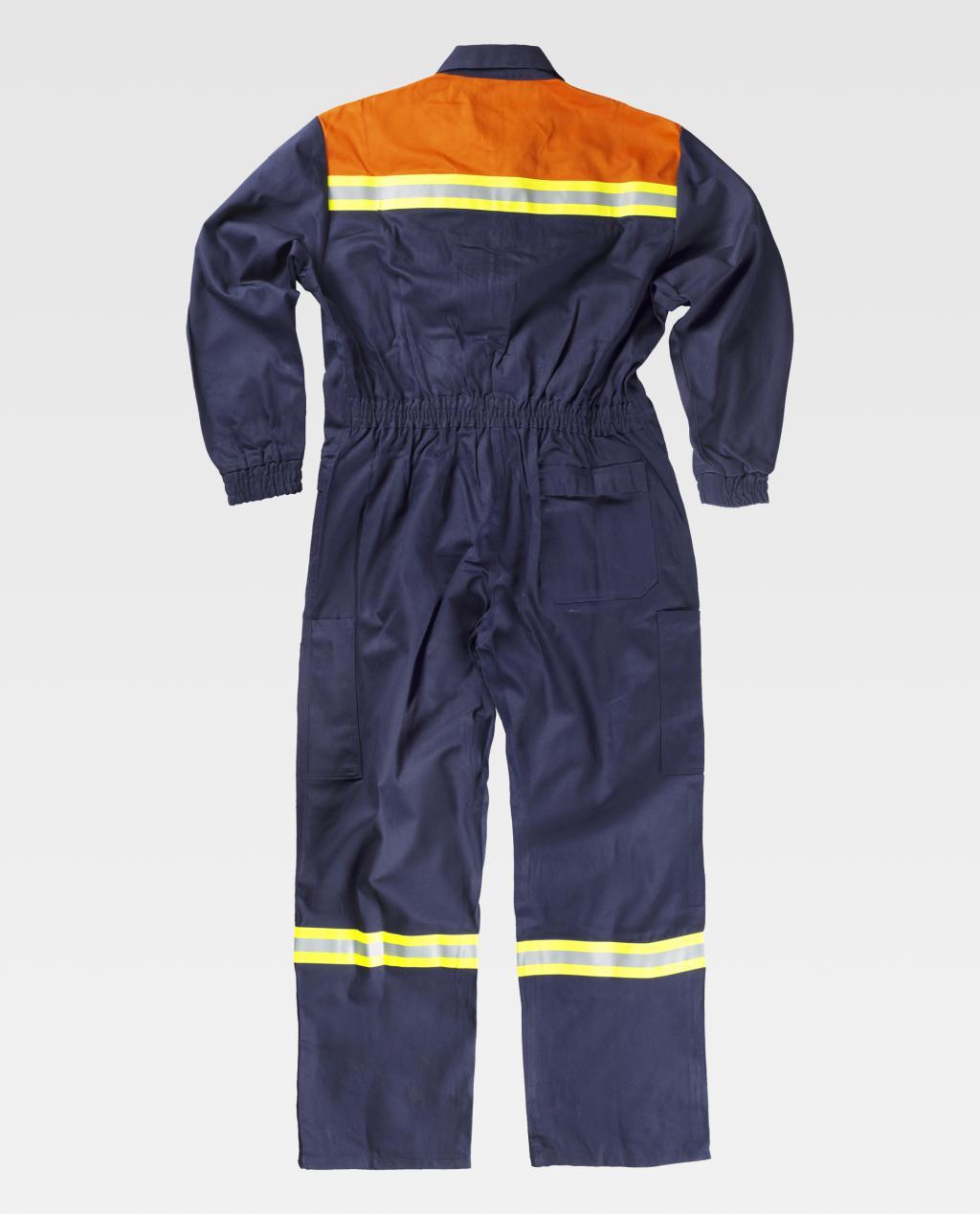 Fato macaco ignífugo de algodão com fita refletora-fluorescente. Gola tipo camiseiro e corpetes combinados. Fecho de correr de metal com puxador duplo oculto e velcro. Um bolso no peito com fecho de correr metálico e lapela de seguridade. Dois bolsos nos costados e um bolso traseiro, todos de chapa sem fecho e com lapela de seguridade. Dois bolsos de espátula. Uma fita refletora-fluorescente ignífuga no peito, costas e perneiras. Punho com elástico. Elástico nas costas.