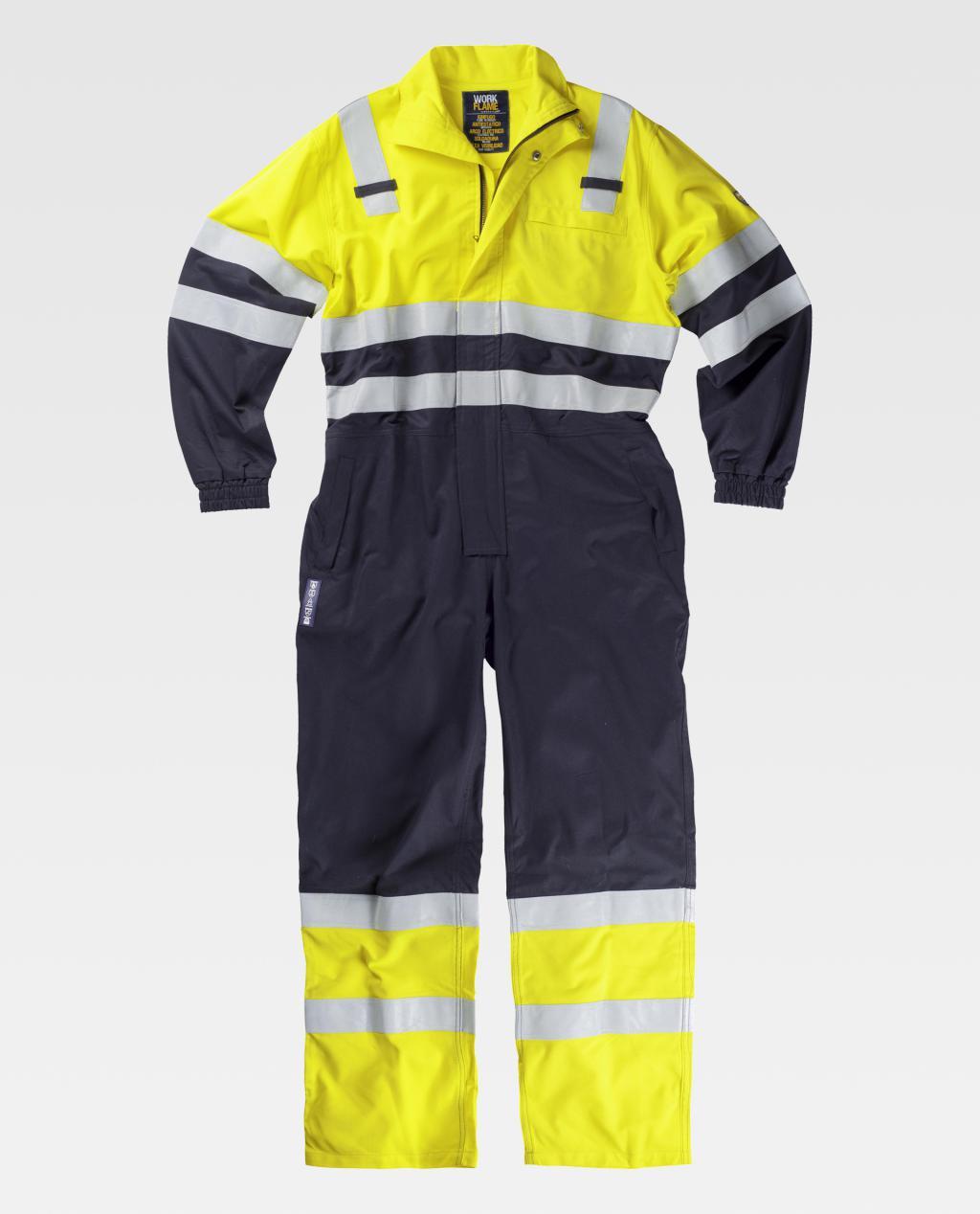 Fato macaco ignífugo, antiestático com protecção para soldadura e arco eléctrico, de alta visibilidade. Gola alta e fecho de correr de metal com puxador duplo e presilhas ocultas por aba. Um bolso no peito, dois bolsos laterais e um bolso traseiro, todos semi-embutidos com aba de seguridade e presilha oculta. Dois passadores no peito. Uma fita refletora ignífuga nos ombros e dois no peito, nas costas, mangas e perneiras. Punho com elástico. Elástico nas costas.