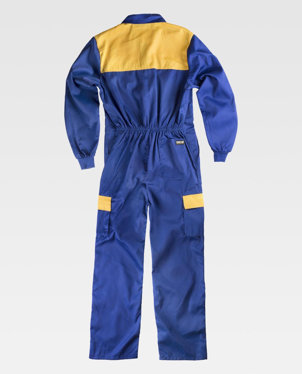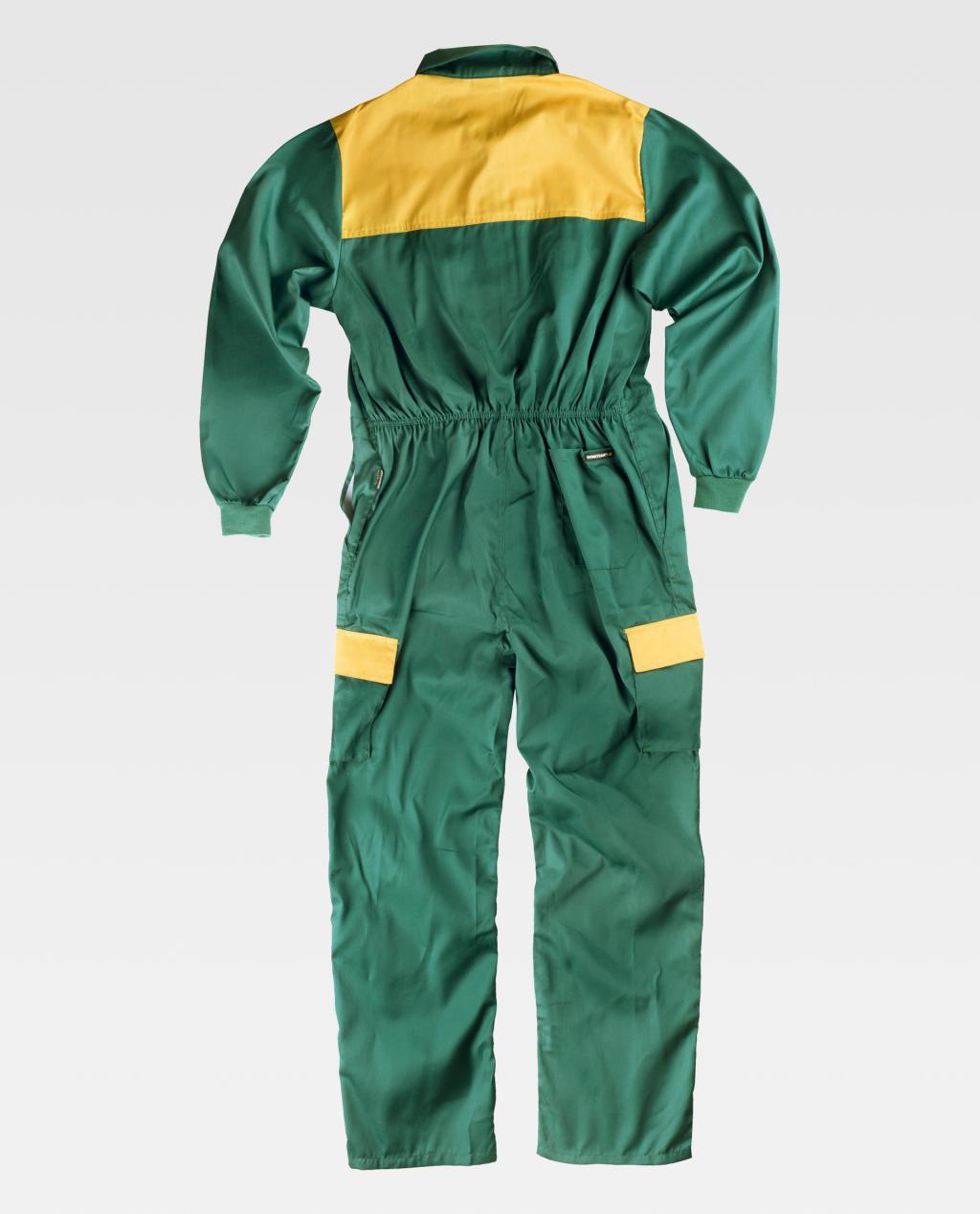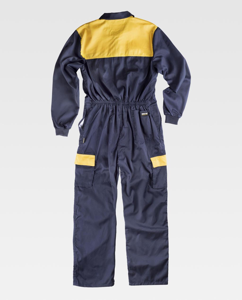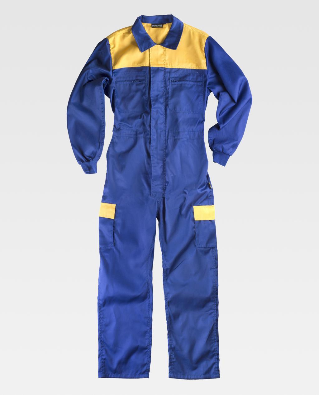 Fato macaco com corpetes e lapelas combinadas. Gola tipo camiseiro e fecho de correr de náilon com puxador duplo oculto por aba com velcro. Dois bolsos no peito com fecho de correr de náilon, dois bolsos de abertura inclinada nos costados. Dois bolsos cargo laterais com lapela de velcro. Um bolso traseiro de chapa. Punho elástico. Cinta com elástico nas costas.