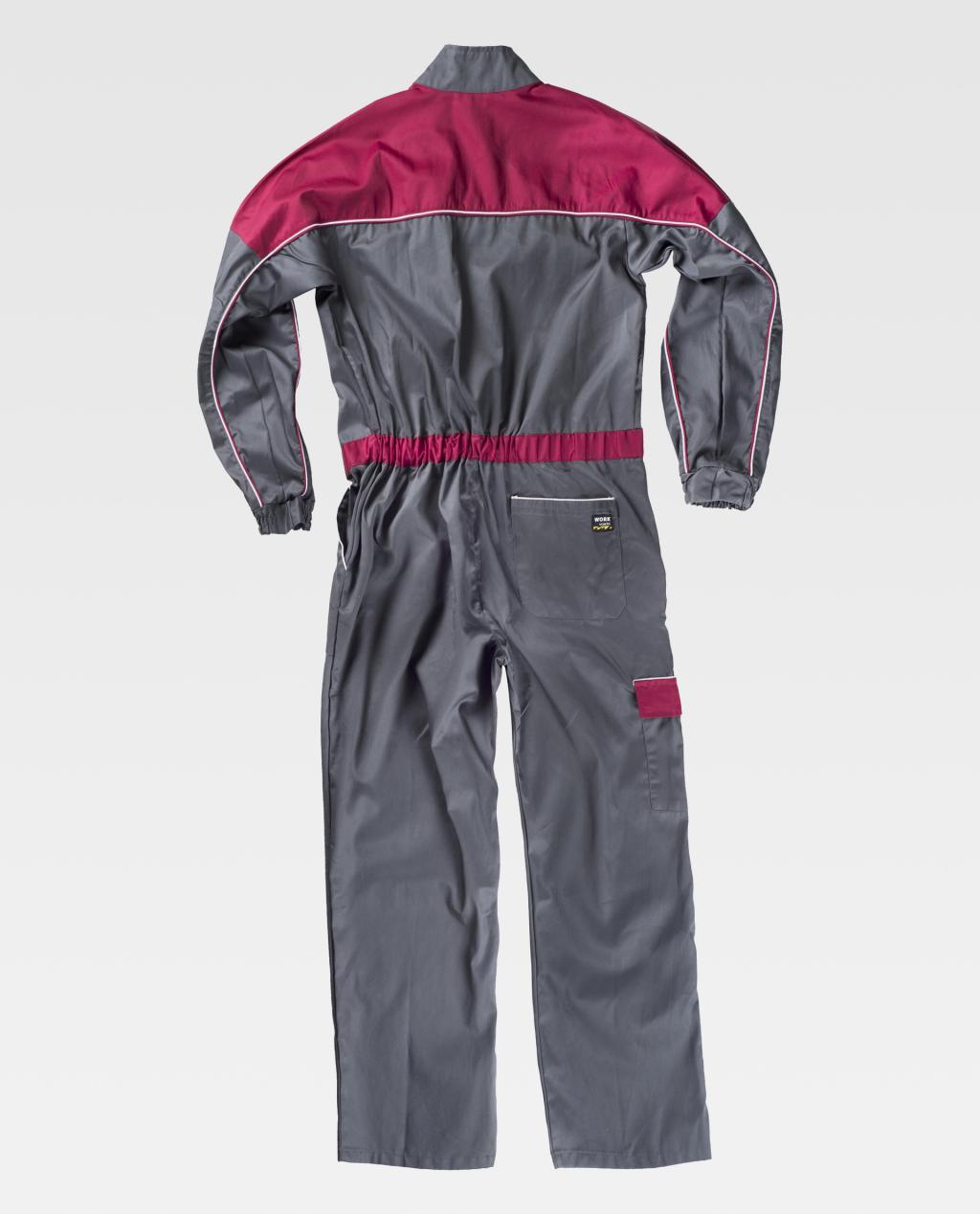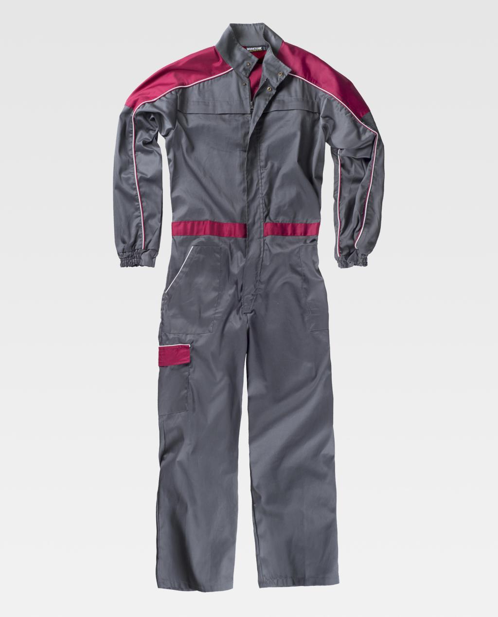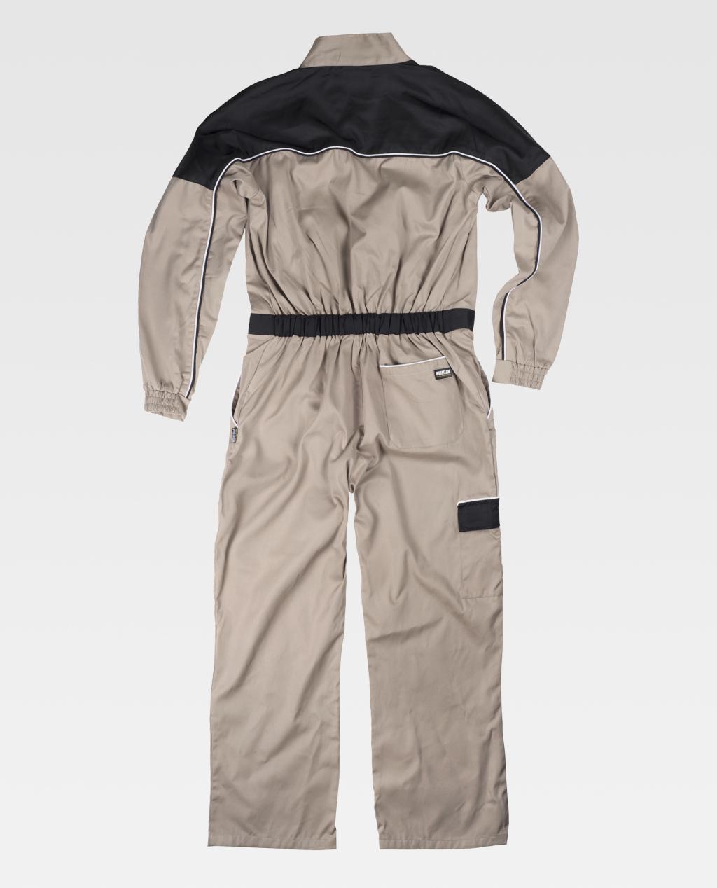 Fato macaco combinado com debruns em contraste. Gola alta e fecho de correr de náilon com puxador duplo e presilhas ocultas por aba. Dois bolsos no peito interiores sobrepostos com fecho de correr de náilon oculto, dois bolsos de chapa de abertura inclinada e debrum nos costados, um bolso cargo lateral com lapela de velcro e debrum em contraste. Um bolso traseiro de chapa com debrum. Corpete nas costas com peça combinada nos ombros. Acabado com debrum duplo que continua na manga. Punho com elástico. Cinta combinada com elástico nas costas.