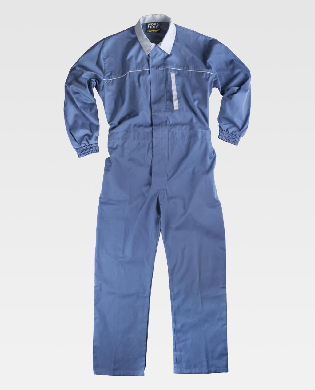 Fato macaco combinado com corpete na frente acabado com debrum em contraste. Gola tipo camiseiro e fecho de correr de náilon com puxador duplo oculto por aba com velcro. Um bolso semi-embutido no peito de abertura vertical com presilha oculta. Dois bolsos de abertura inclinada nos costados. Um bolso de chapa traseiro e um bolso de espátula dupla. Gola e detalhe do bolso combinado. Punho elástico. Cinta com elástico nas costas.