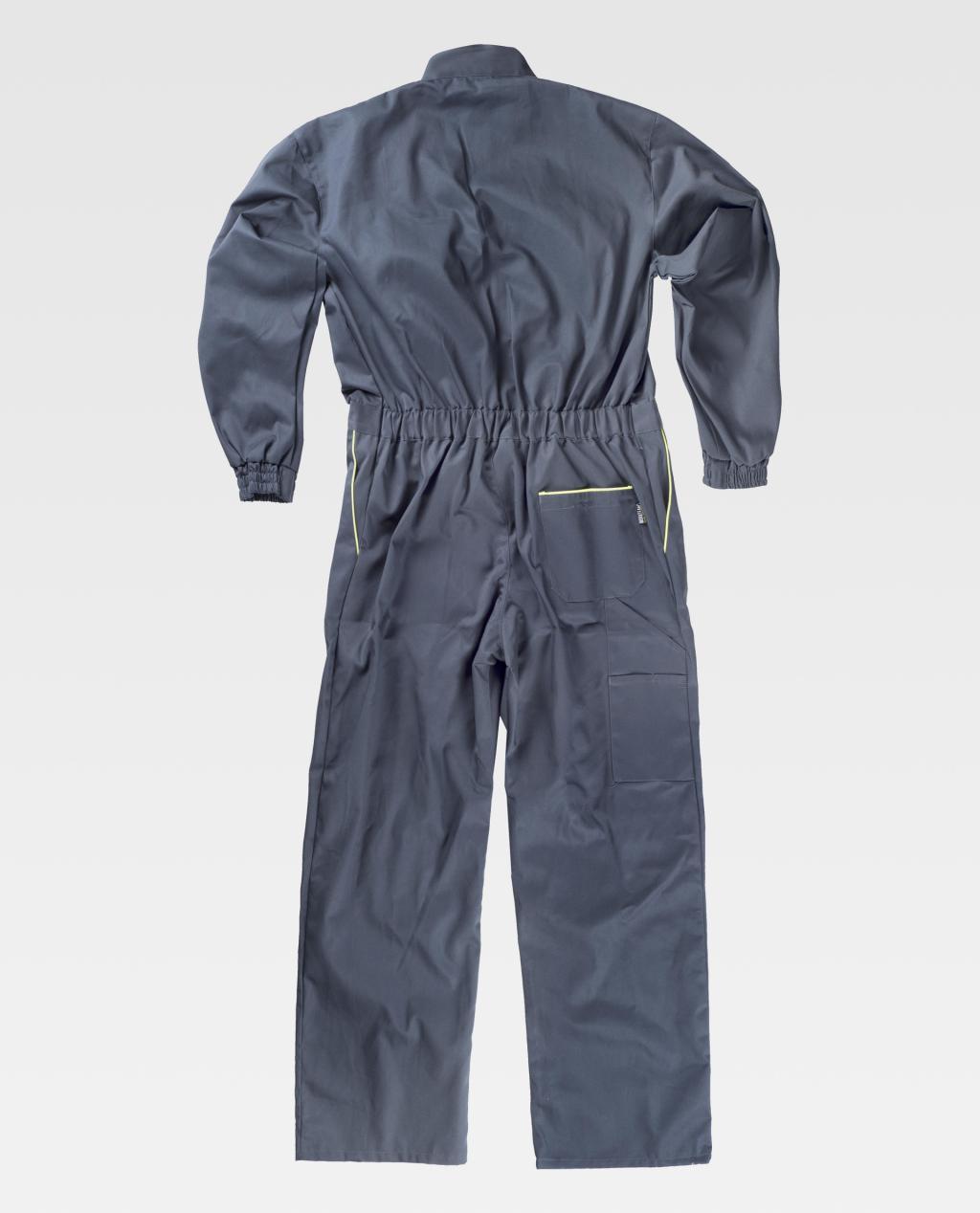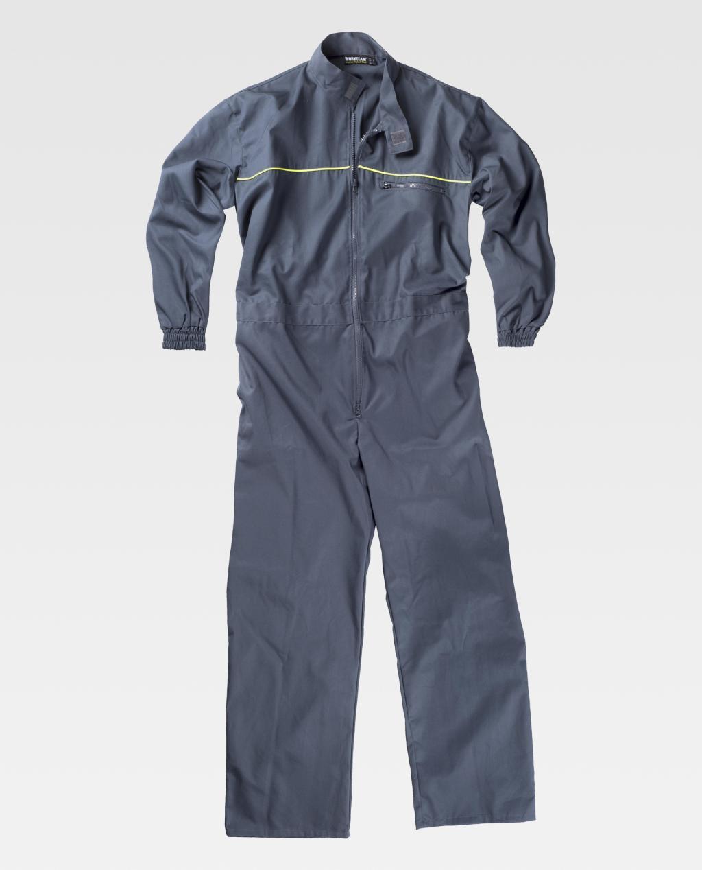 Fato macaco com corpete na frente acabado com bedrum em contraste. Gola alta com velcro e fecho de correr com puxador duplo. Um bolso no peito interior com fecho de correr, dois bolsos de abertura inclinada com debrum em contraste nos costados. Um bolso traseiro de chapa com dedrum e um bolso de espátula dupla. Fechos de correr injectados. Punho com elástico. debruns de alta visibilidade. Cinta com elástico nas costas.