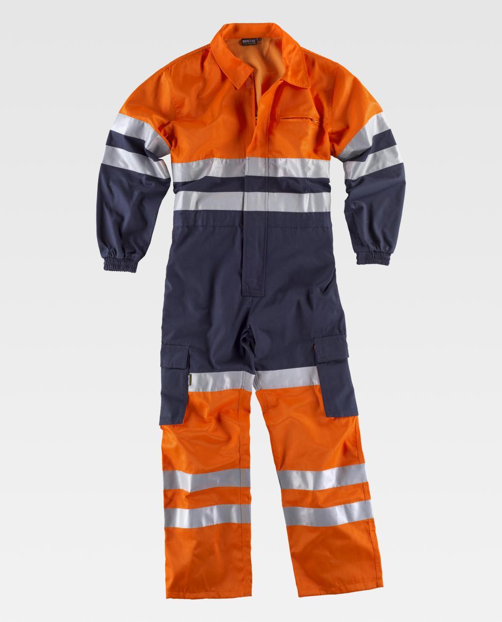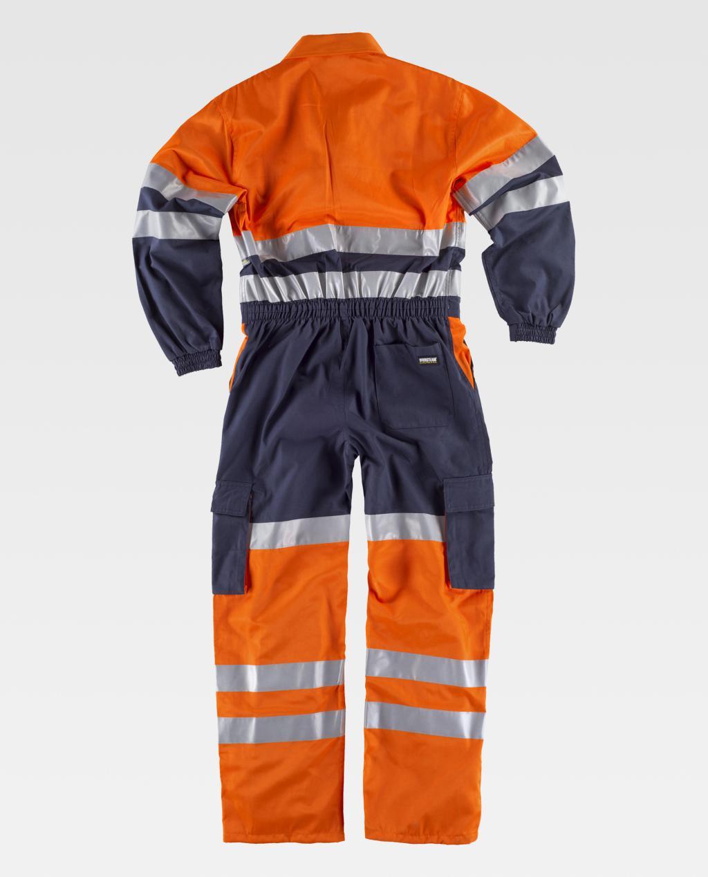 Fato macaco combinado de alta visibilidade e fitas refletoras. Gola tipo camiseiro e fecho de correr de puxador duplo oculto por aba de velcro. Um bolso no peito interior com fecho de correr, dois bolsos laterais de abertura inclinada, dois bolsos cargo laterais com fole e lapela de velcro. Um bolso traseiro de chapa. Fitas refletoras no peito, nas costas, nas mangas e nas perneiras. Parte superior, inferior e detalhes dos bolsos de alta visibilidade. Punho elástico. Elástico nas costas.