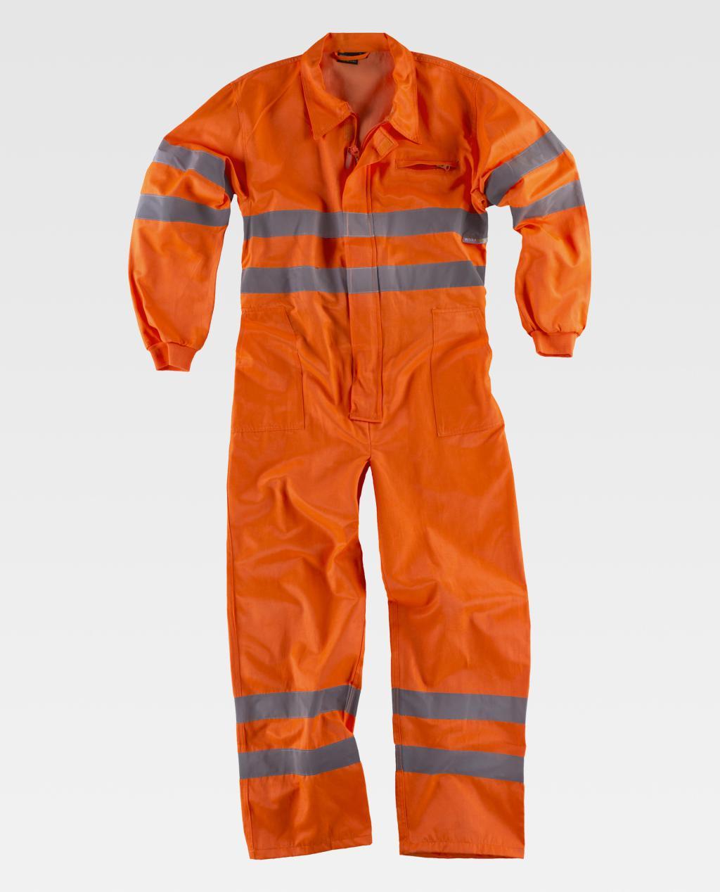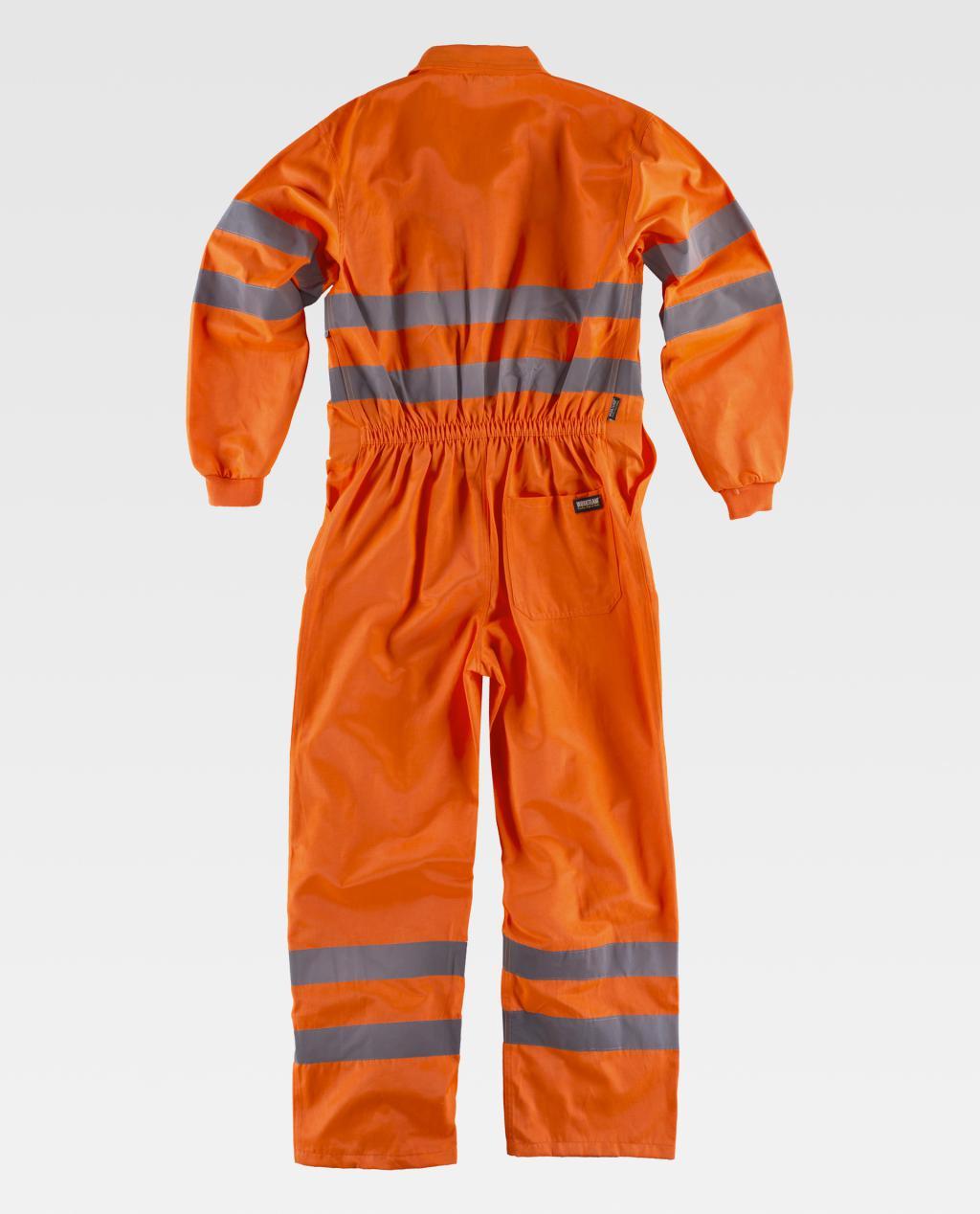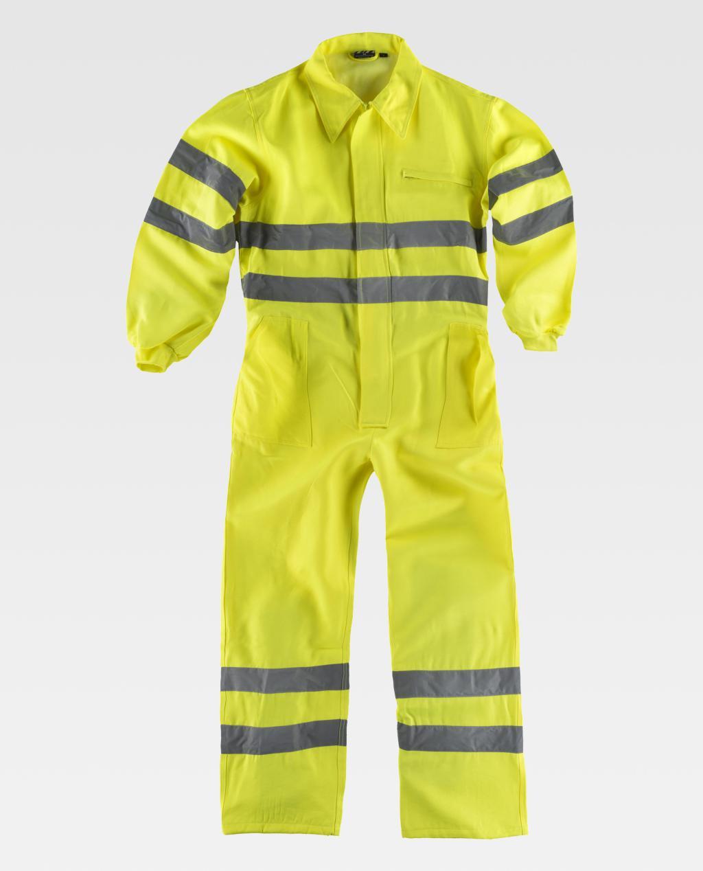 Fato macaco de alta visibilidade com fitas refletoras. Fecho de correr de puxador duplo oculto por aba com velcro. Um bolso no peito com fecho de correr, dois bolsos de abertura inclinada nos costados. Um bolso traseiro de chapa. Duas fitas refletoras no peito, nas costas, nas mangas e nas perneiras. Punho elástico. Elástico nas costas.