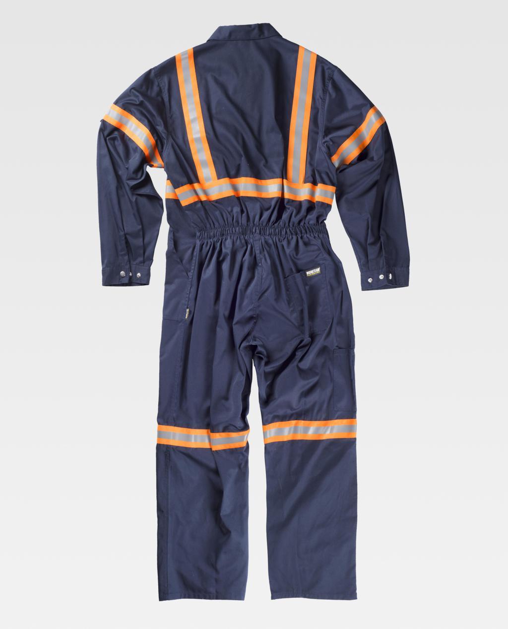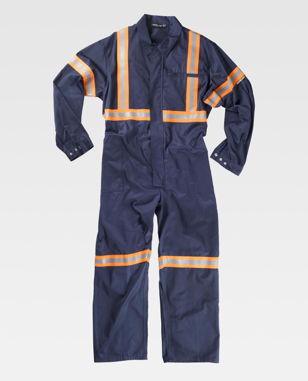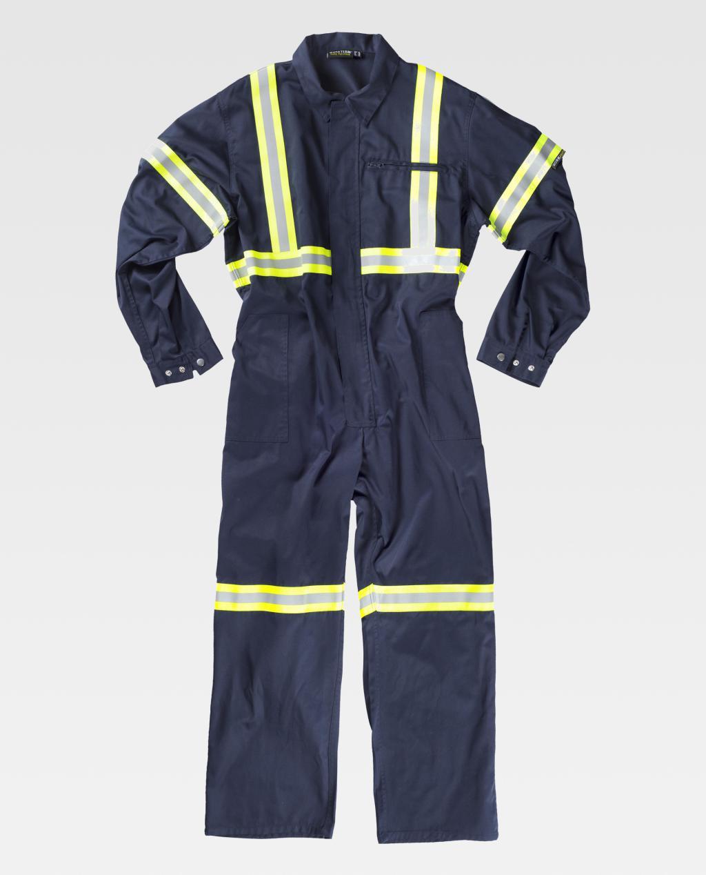 Fato macaco com fitas refletoras-fluorescentes. Gola tipo camiseiro e fecho de correr de náilon com puxador duplo oculto por aba com velcro. Um bolso no peito interior com fecho de correr de náilon, dois bolsos de chapa de abertura inclinada nos costados. Um bolso traseiro de chapa e um bolso de espátula. Uma fita fluorescente com uma fita refletora no peito, nas costas, nos ombros, mangas e perneiras. Punho com presilha metálica. Elástico nas costas.