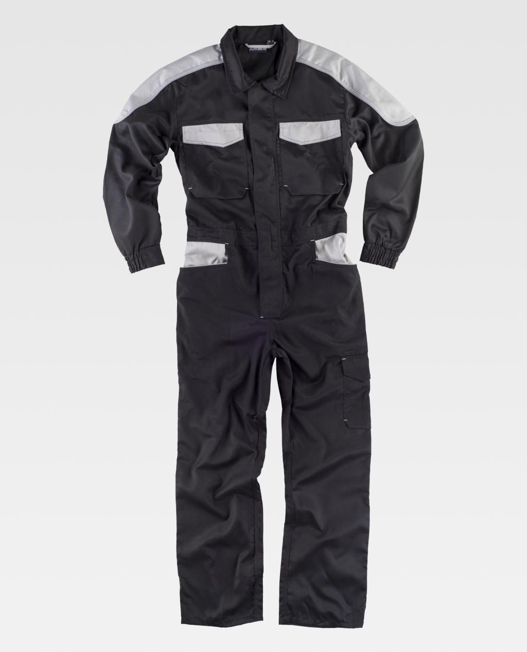 Fato macaco combinado, com reforços e costura tripla. Gola tipo camiseiro e fecho de correr de náilon de puxador duplo oculto por aba com velcro. Dois bolsos no peito com lapela de velcro, dois bolsos de abertura inclinada e debrum nos costados, um bolso cargo lateral com lapela de velcro. Dois bolsos traseiros com prega no baixo, um com lapela de velcro e um bolso de espátula. Passador porta martelo. Corpete na frente. Peça combinada nos ombros e mangas acabadas com debrum refletor. Joelheiras e reforço no assento. Presilhas em contraste. Punho com elástico. Elástico nas costas. Tratamento do tecido para maior estabilidade da cor, resistente às lavagens até 60º.