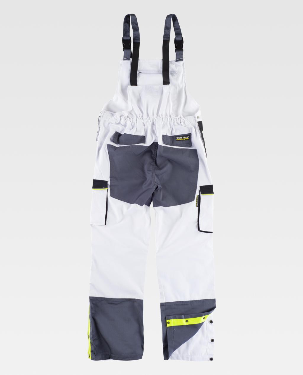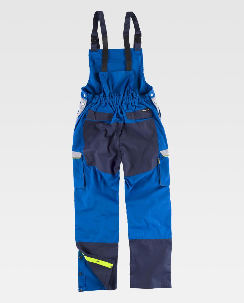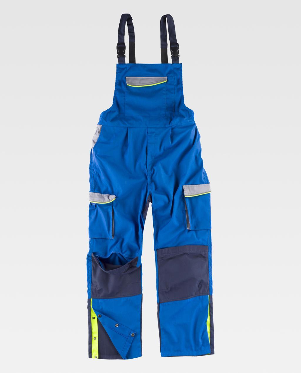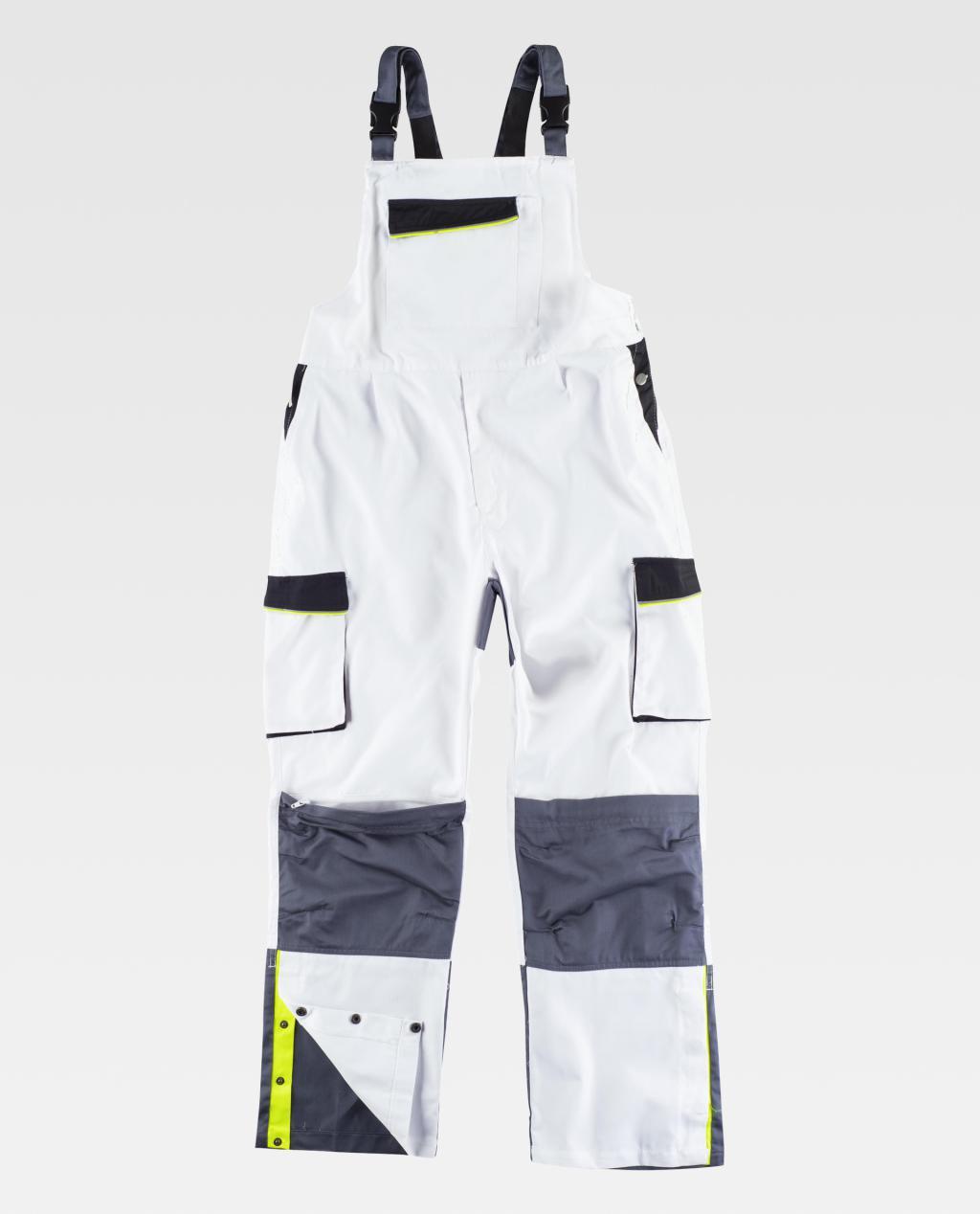 Jardineira tricolor com reforços e debruns de alta visibilidade. Meias costas tapadas, suspensórios com elástico e fivelas automáticas. Um bolso no peito de chapa com lapela de velcro, dois bolsos de abertura inclinada nos costados, dois bolsos cargo laterais de velcro. Dois bolsos traseiros de chapa com lapela de velcro. Lapelas acabadas com debruns duplos. Reforçado com fecho de correr para joelheiras de protecção. Reforço no assento. Abertura nas perneiras com fecho de presilhas. Fecho de botões metálicos nos laterais e braguilha de fecho de correr de náilon. Elástico nas costas.