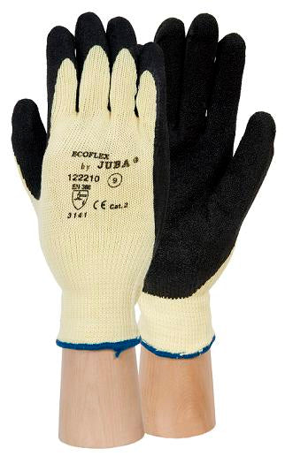 Luva de algodão com cobrimento em látex rugoso na palma das mãos e dedos.