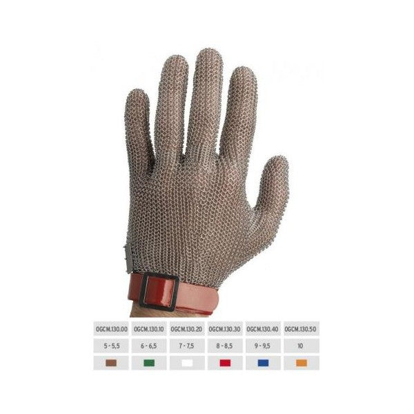 Luva de 5 dedos de malha metálica, em aço inoxidável e reversível.