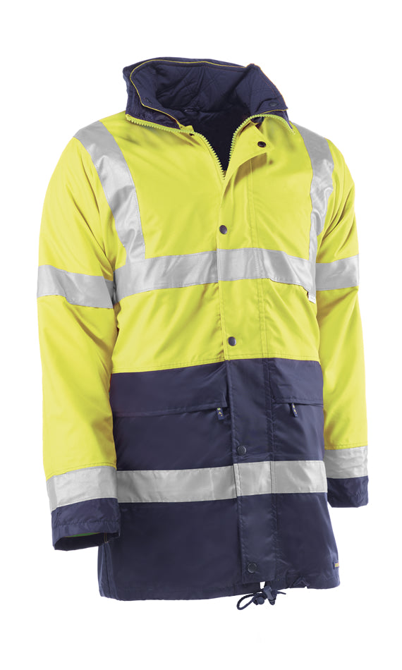 - Faixas refletoras de 3M® ScotchliteTM. Dois bolsos frontais e um interior. Dispõe no seu interior de um casaco reversível com mangas desmontáveis, dispõe de dois bolsos e um interior, com bandas refletoras 3M® e punho elástico. Capuz interno fixada com fecho de velcro. Com cordão na parte inferior para melhor ajuste.