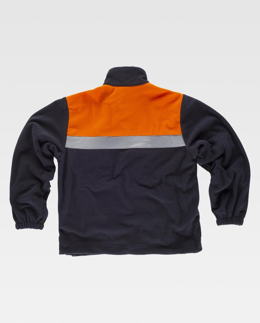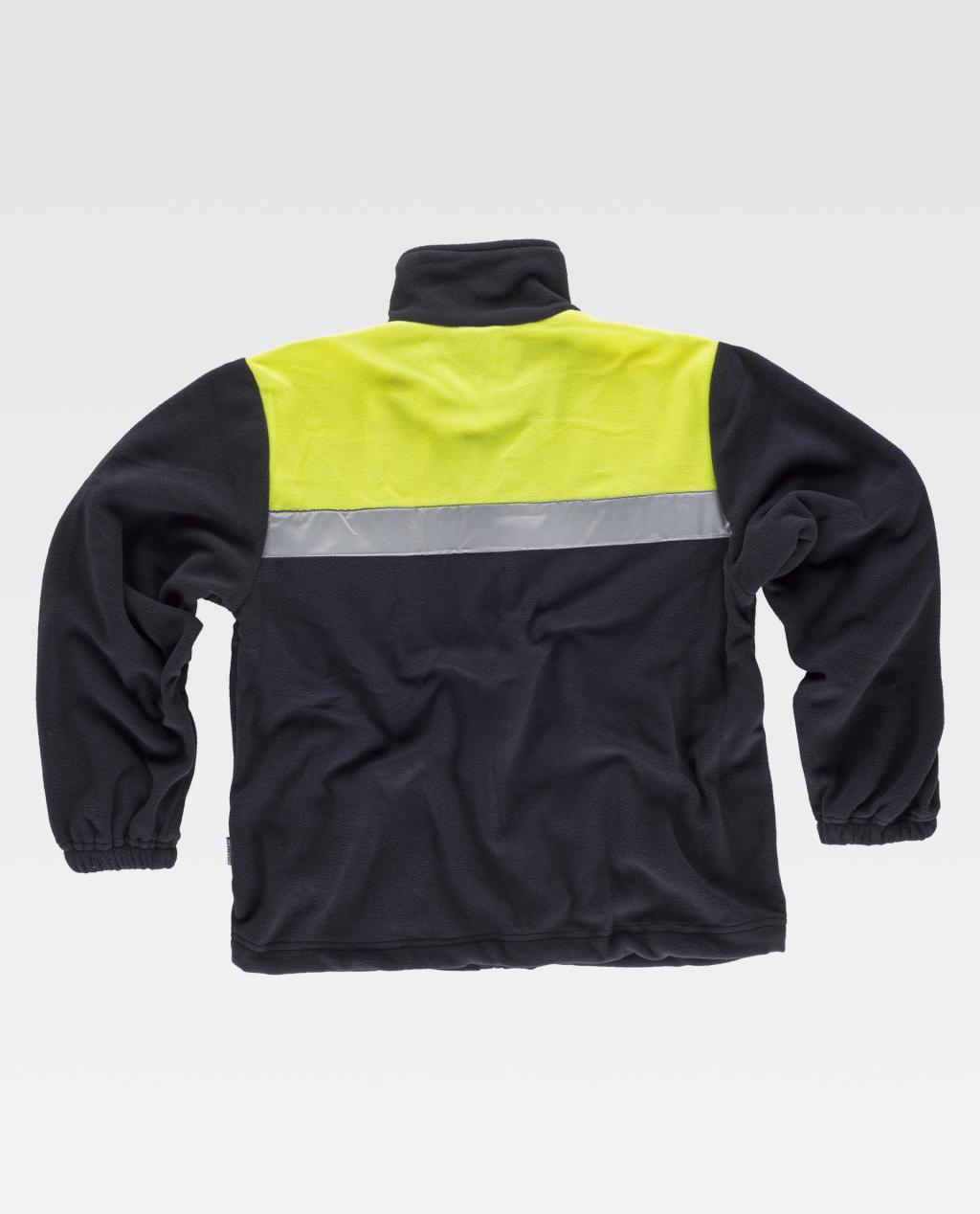 Casaco polar combinado com fitas refletoras. Parte superior de alta visibilidade. Gola alta e fecho de correr de náilon. Um bolso no peito e dois bolsos laterais interiores com fecho de correr de náilon. Uma fita refletora no peito e nas costas. Punho com elástico. Cordão elástico com peça ajustável no baixo.