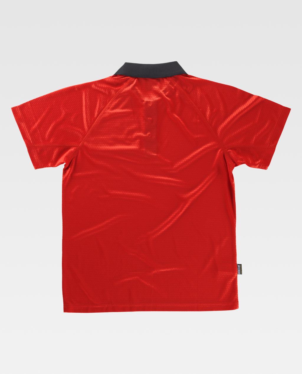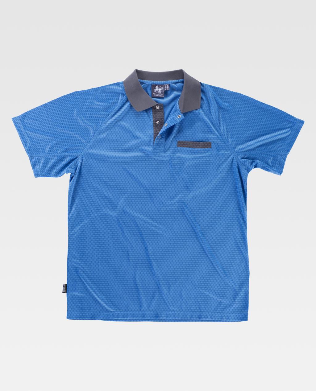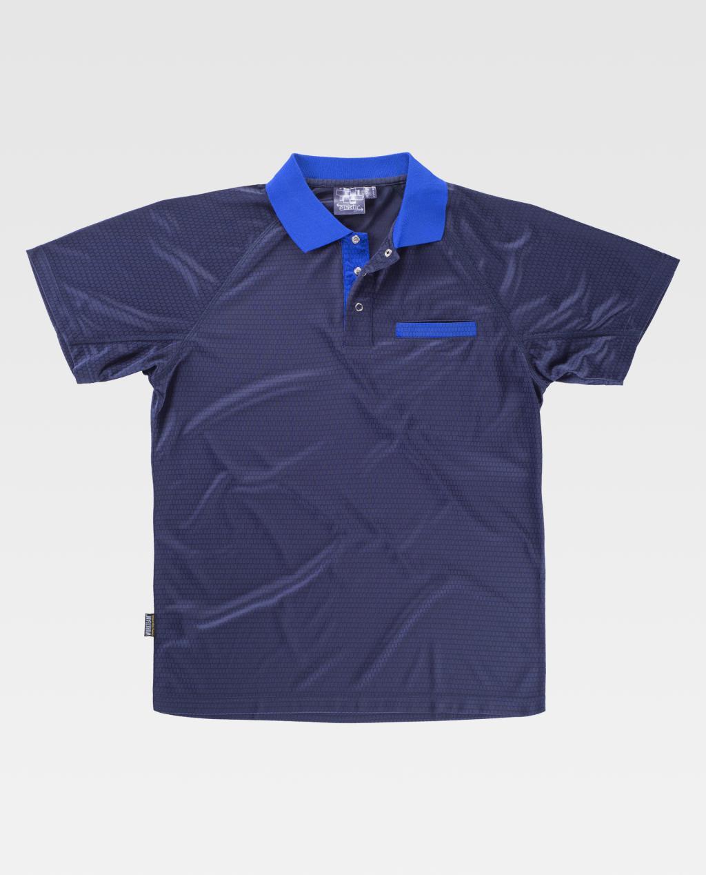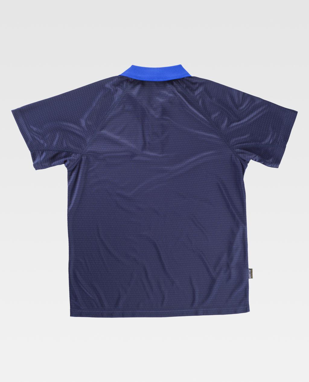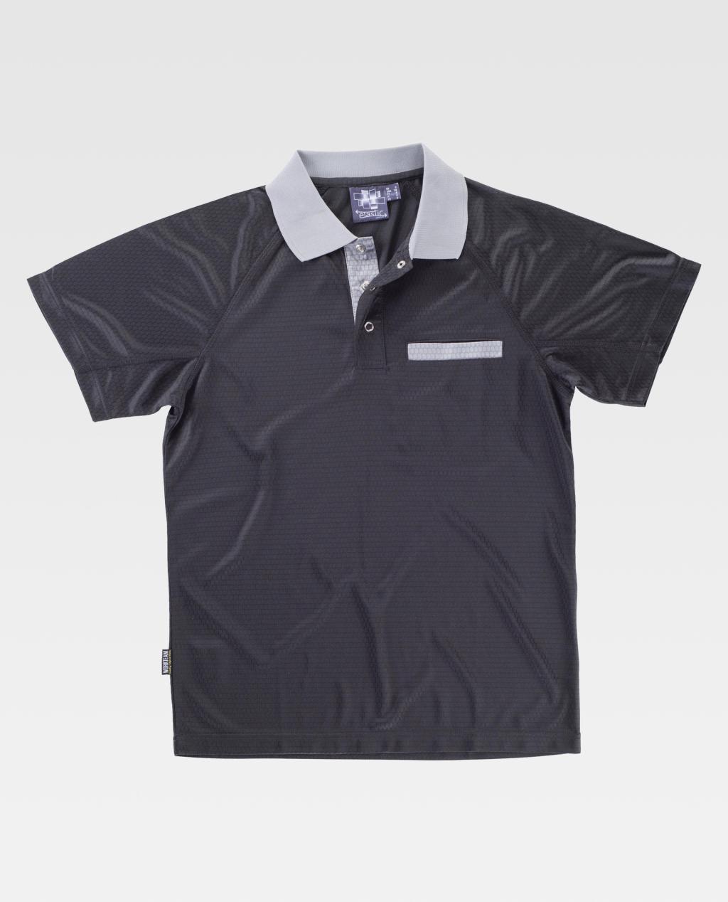 Pólo combinado de manga curta em tecido técnico. Gola clássica com carcela de três presilhas. Abrange nas costuras no interior da gola, costuras reforçadas e manga raglã. Um bolso semi-embutido no peito. Detalhe do bolso, gola e peça da gola em contraste. Desportiva, ligeira e de secagem rápida. Gola em ponto de canelado.
