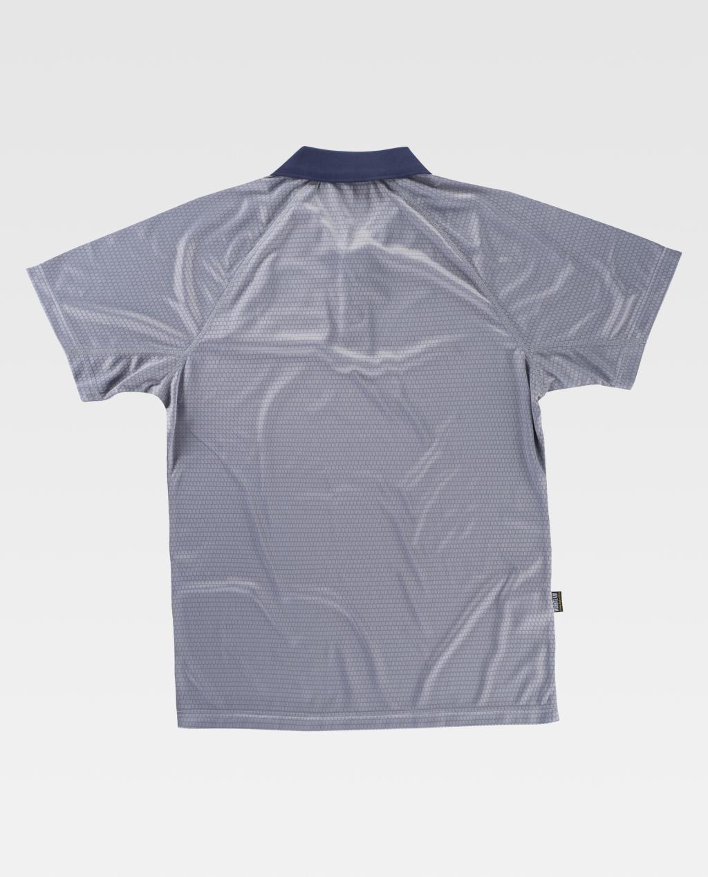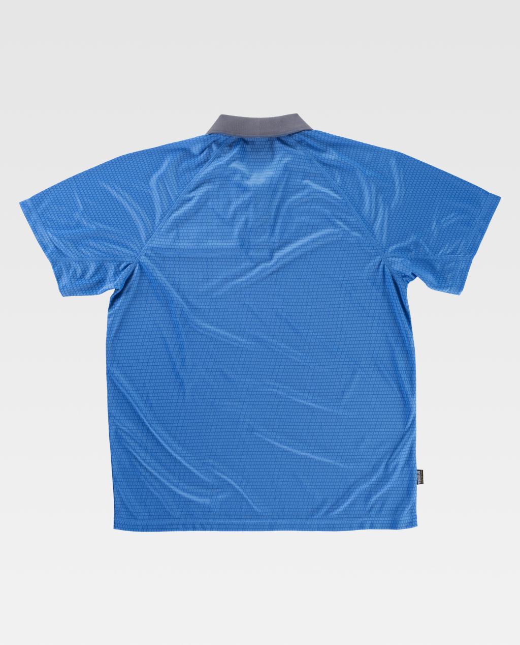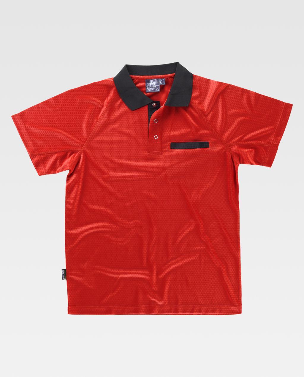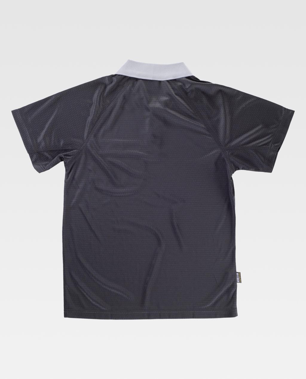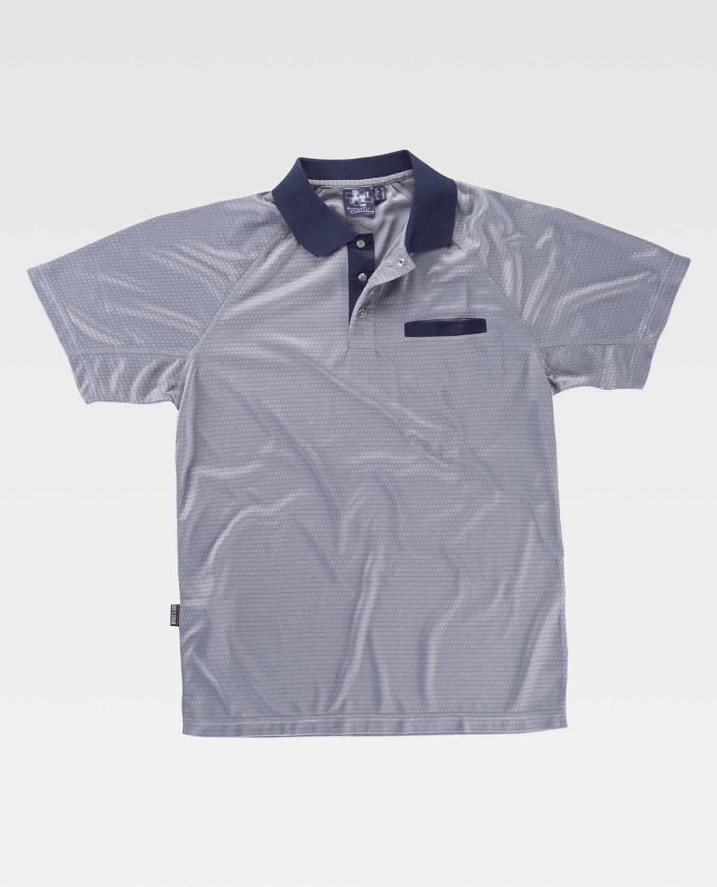 Pólo combinado de manga curta em tecido técnico. Gola clássica com carcela de três presilhas. Abrange nas costuras no interior da gola, costuras reforçadas e manga raglã. Um bolso semi-embutido no peito. Detalhe do bolso, gola e peça da gola em contraste. Desportiva, ligeira e de secagem rápida. Gola em ponto de canelado.