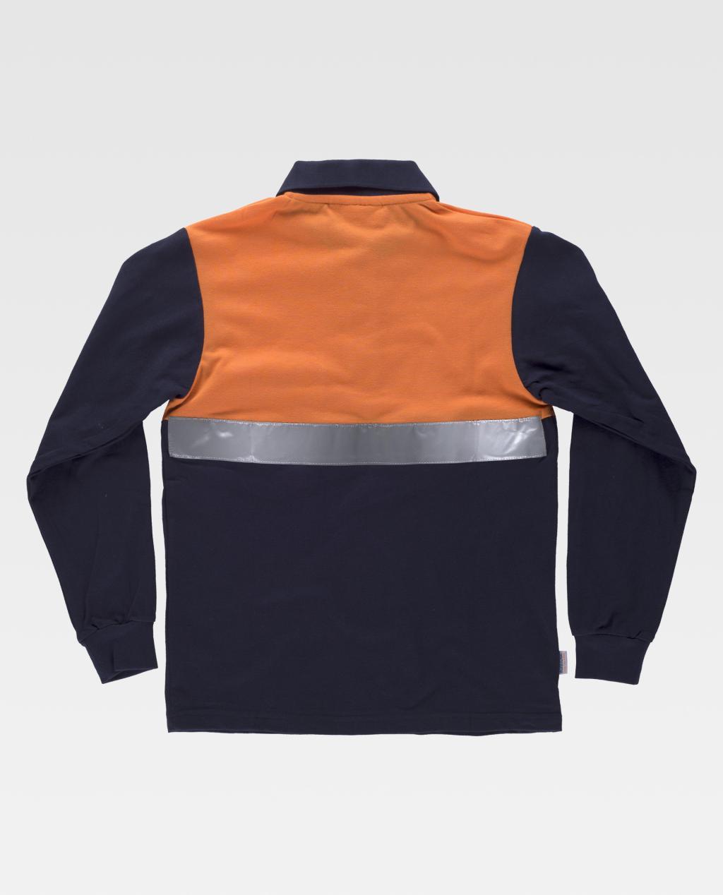 Pólo combinado de manga comprida em tecido pique de algodão com fita refletora. Parte superior de alta visibilidade. Gola clássica com carcela de três botões e abrange nas costuras interiores. Um bolso semi-embutido no peito. Refletor no peito e nas costas. Punho elástico. Gola em ponto de canelado.