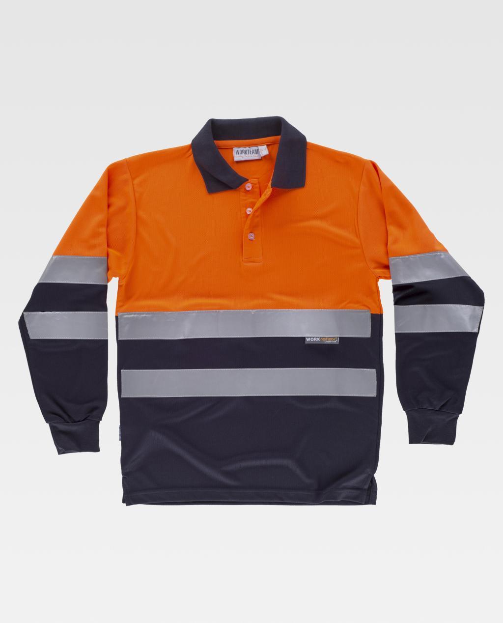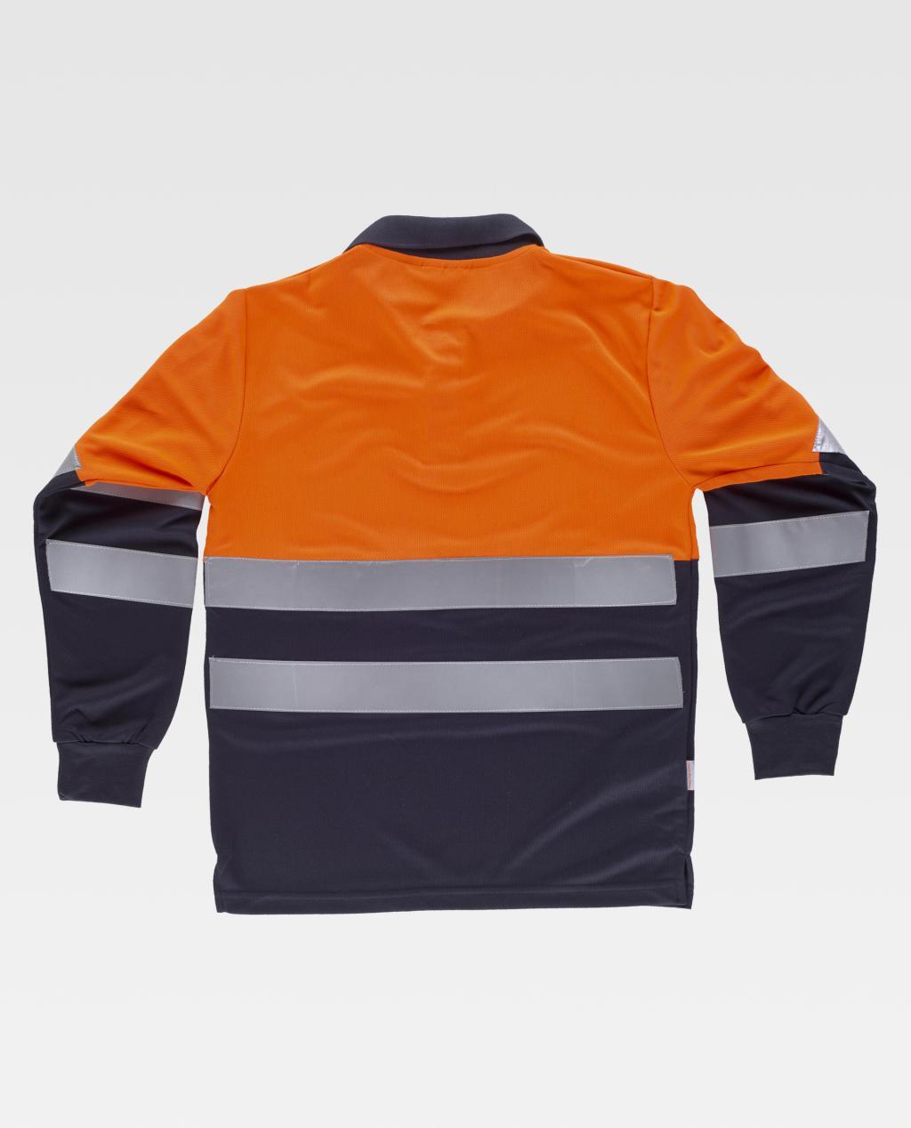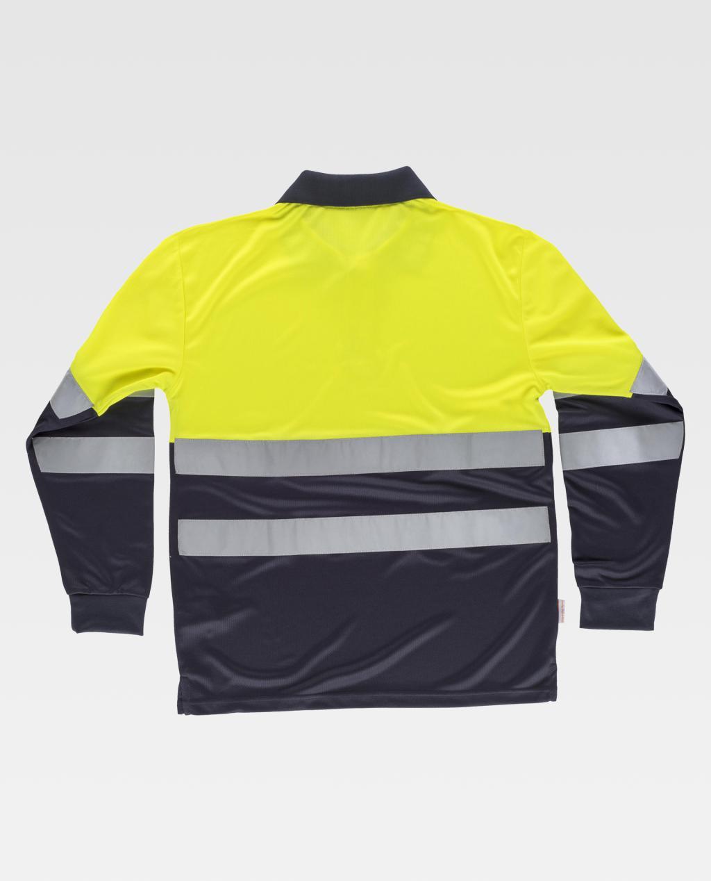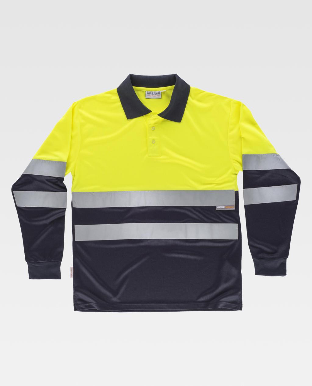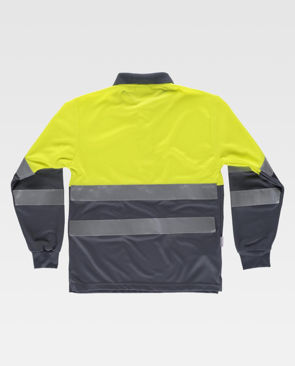 Pólo combinado de manga comprida em poliéster bird's eye com fitas refletoras. Parte superior de alta visibilidade. Gola clássica com carcela de três botões e abrange nas costuras interiores. Aberturas laterais. Duas fitas refletoras no peito, nas costas e mangas. Punho elástico. Gola e punho em ponto de canelado. Tecido fresco e ligeiro de alta permeabilidade do ar. Transpirável, de fácil secagem e resistente a encolher.