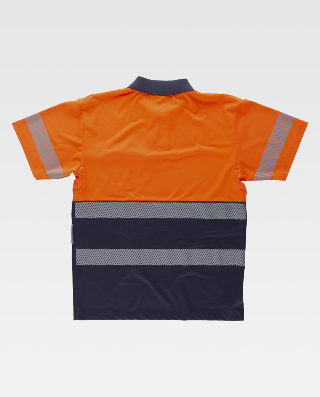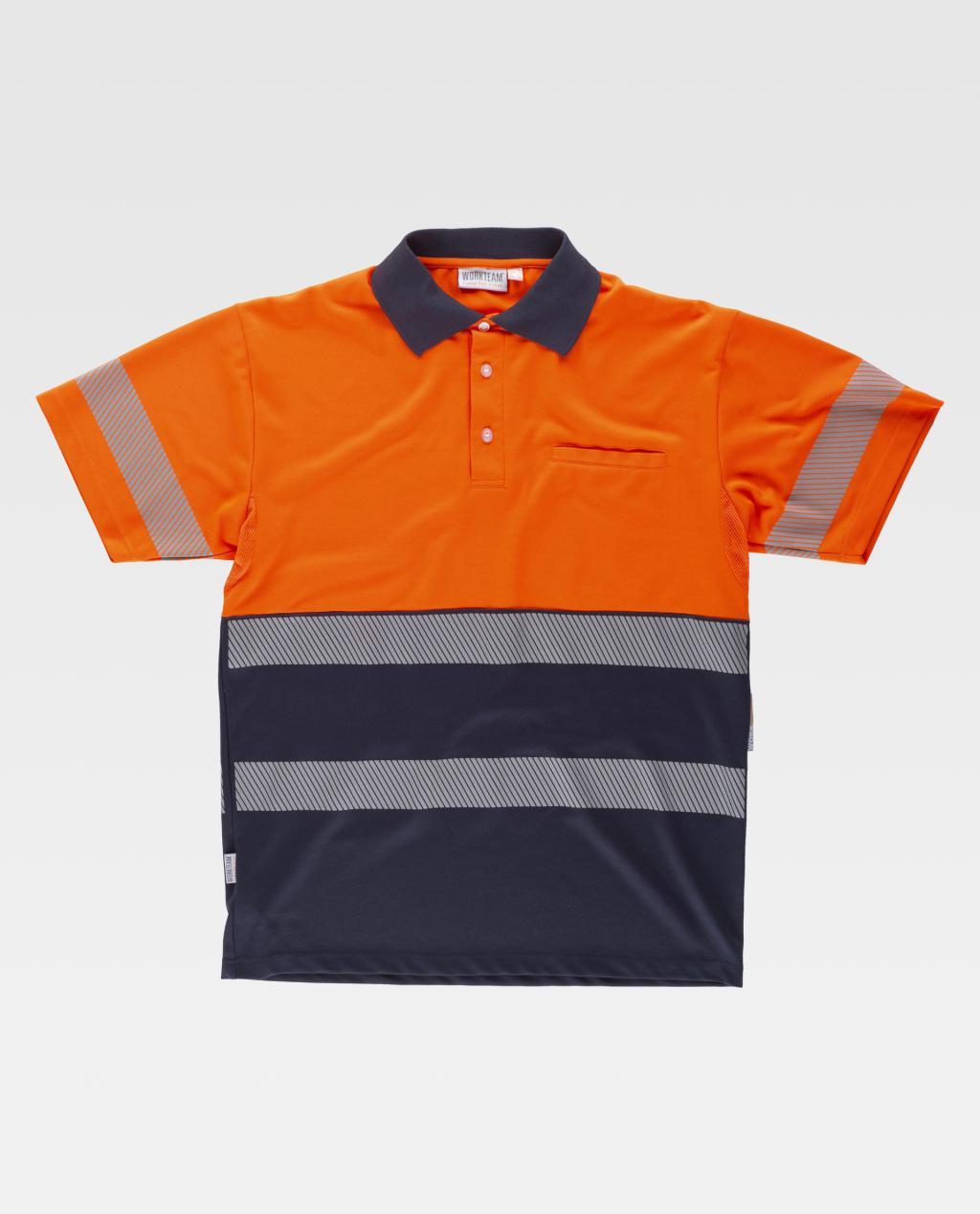 Pólo combinado de manga curta em micro pique de poliéster. Parte superior de alta visibilidade. Refletores e manga de rede para regular a transpiração nas axilas. Gola clássica com carcela de três botões e abrange nas costuras interiores. Um bolso semi-embutido no peito. Refletor discontinuado termo adesivo nas mangas e dois no peito e nas costas. Gola em ponto de canelado.