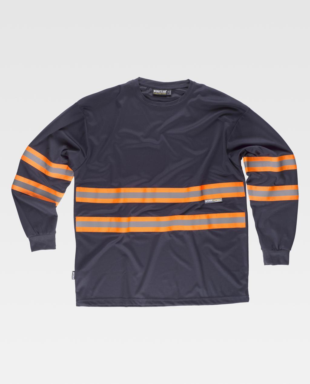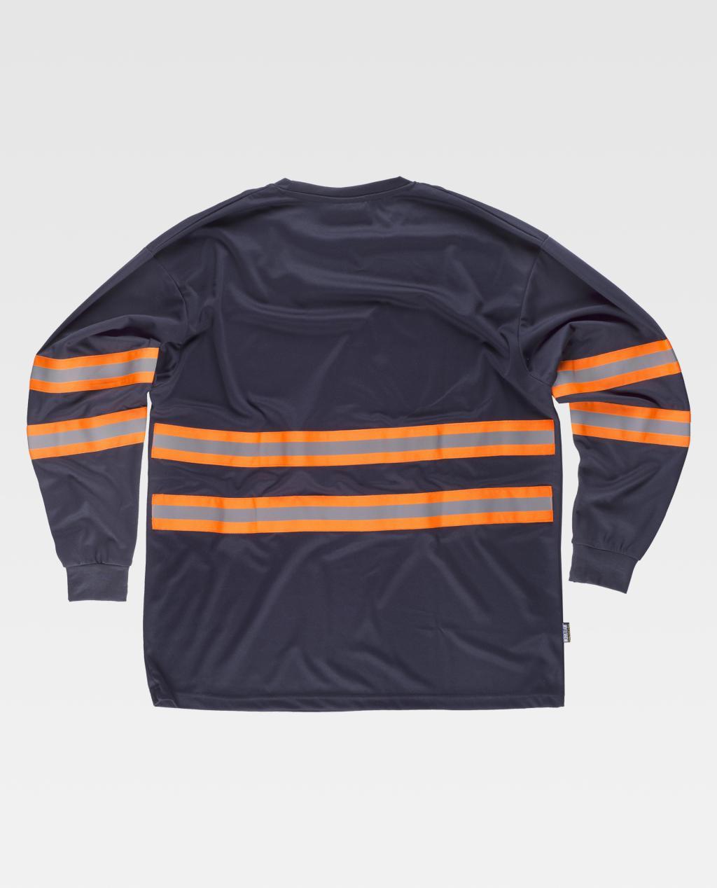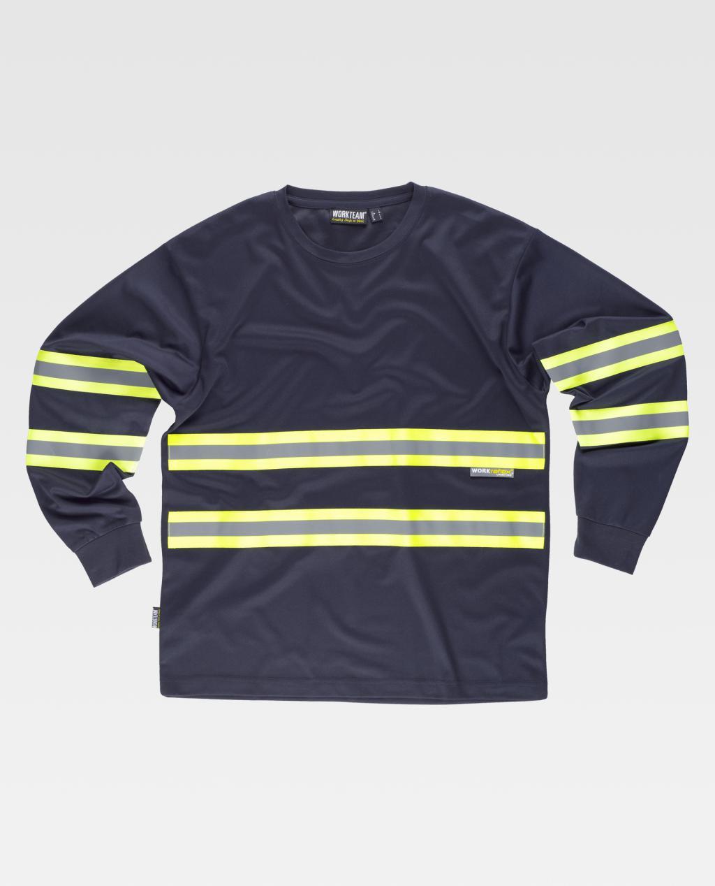 T-shirt clássica de manga comprida em tecido piqué e fitas refletoras-fluorescentes. Gola redonda com abrange nas costuras no interior. Duas fitas fluorescentes com uma fita refletora no peito, nas costas e mangas. Punho elástico.