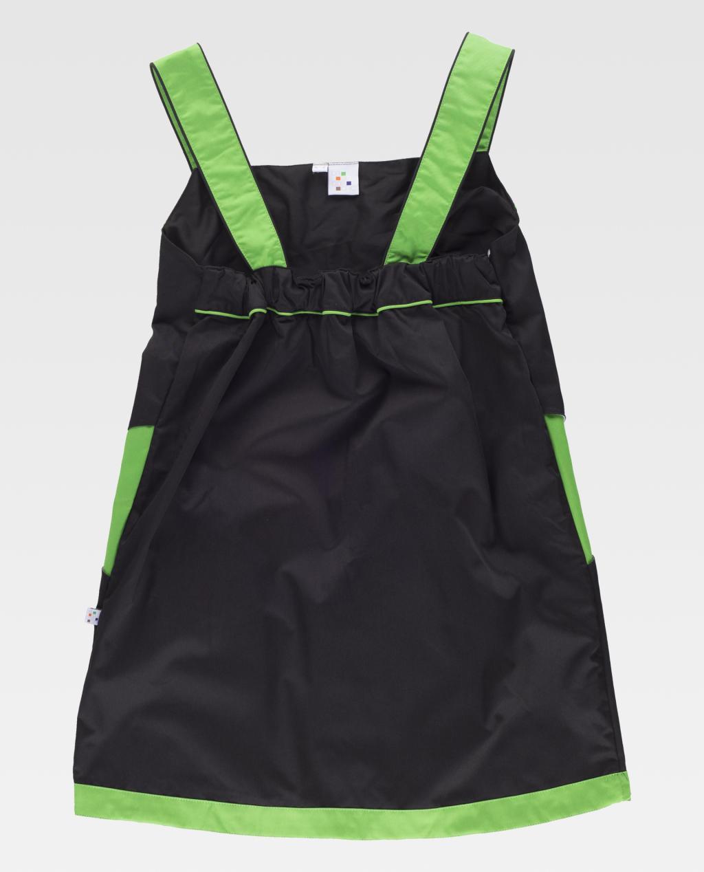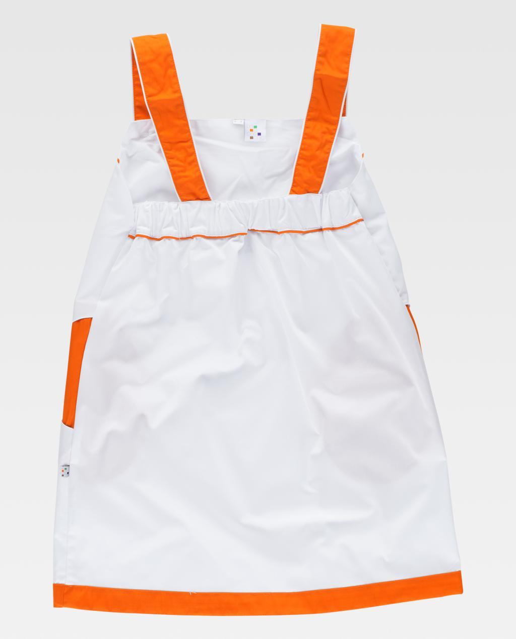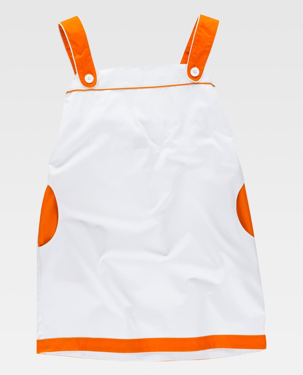 Vestido combinado com suspensórios e corpete na frente acabados com debrum. Dois bolsos laterais interiores de abertura redonda. Suspensórios, detalhe no bolso, baixo e debruns em contraste. Fecho de correr invisível lateral e suspensórios com botão. Elástico nas costas.