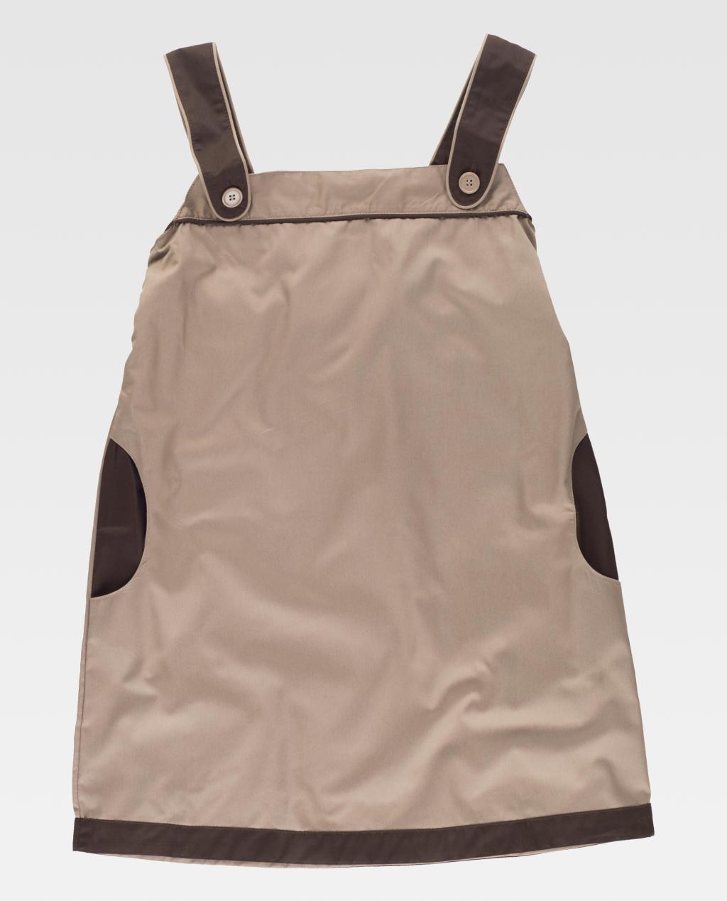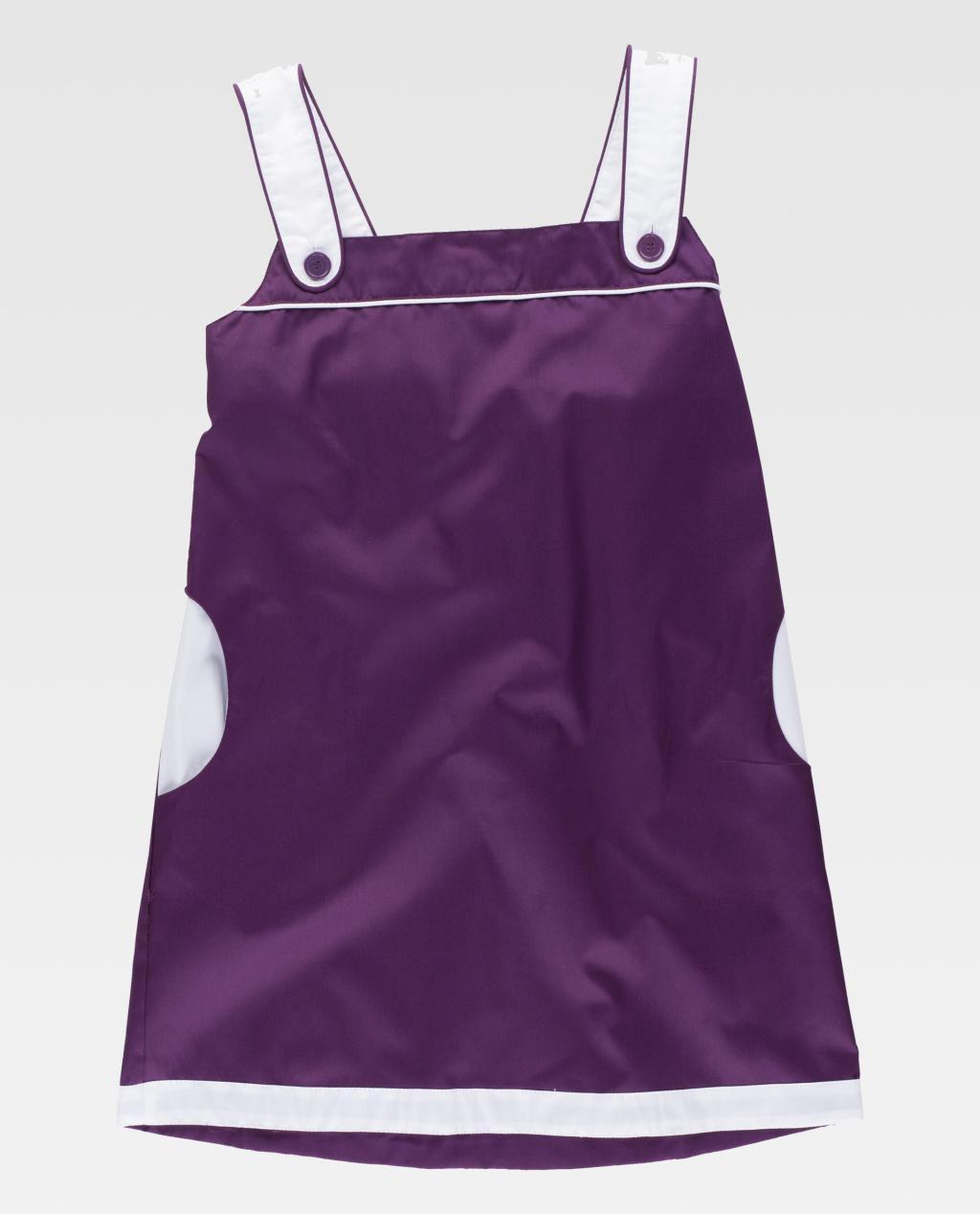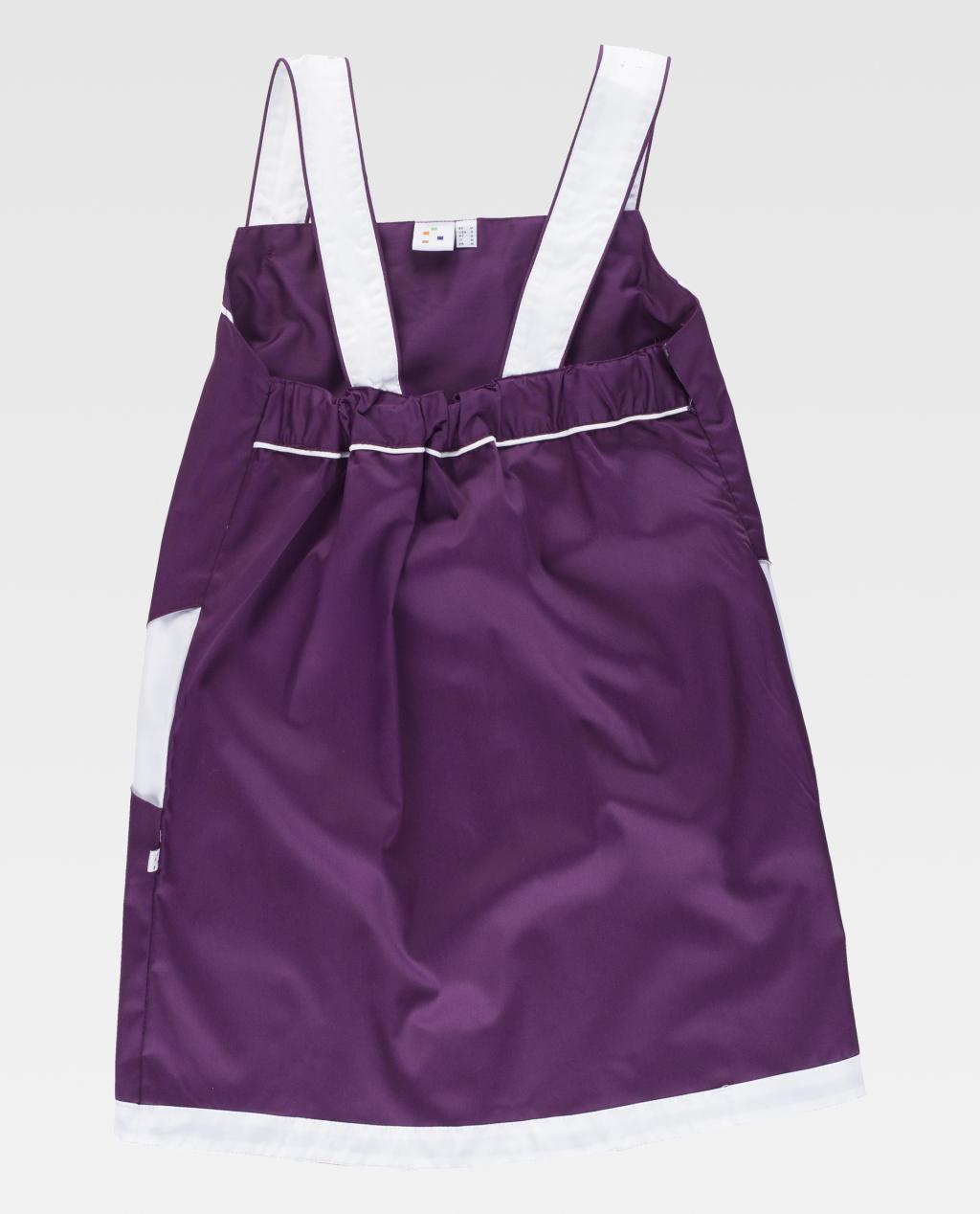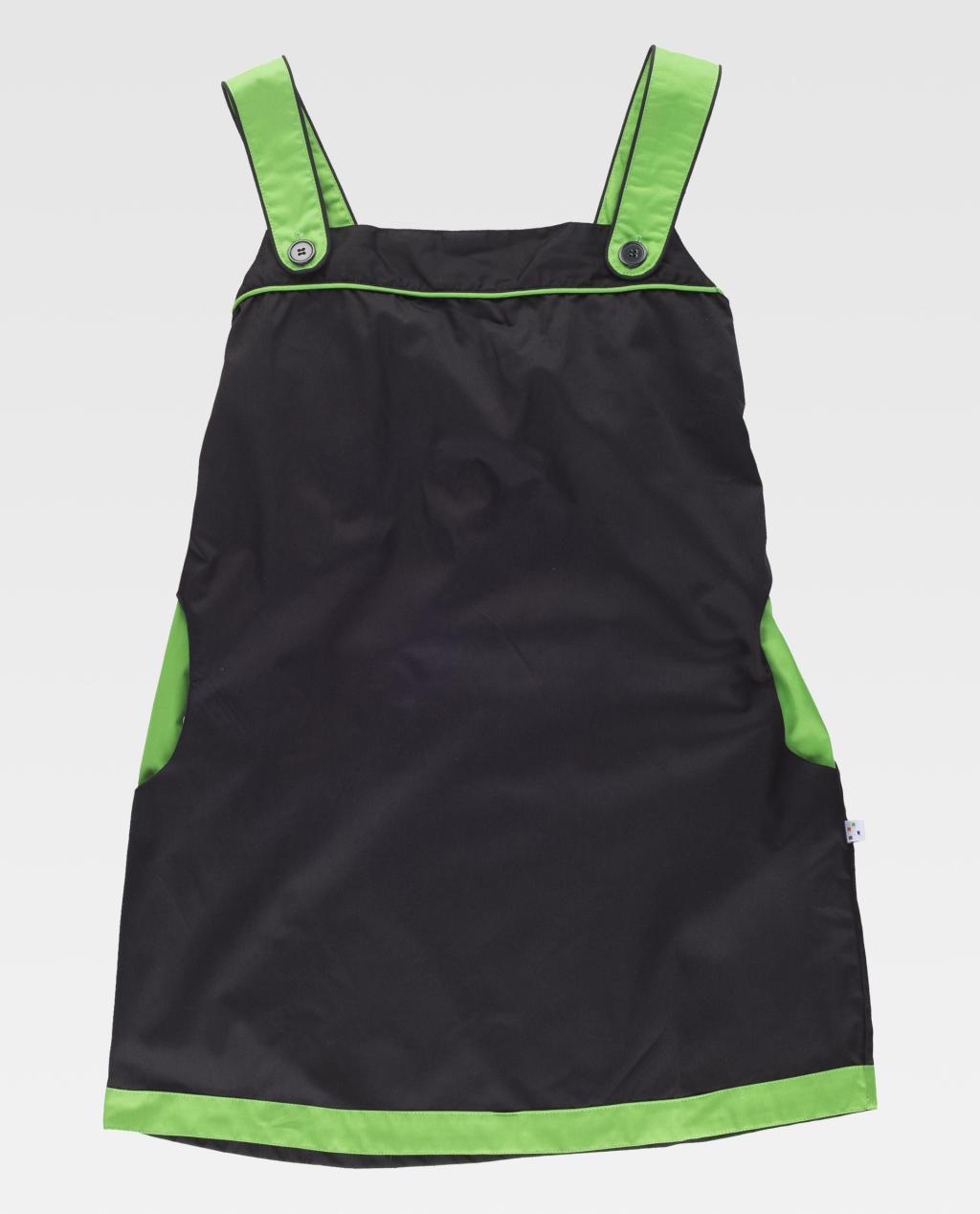 Vestido combinado com suspensórios e corpete na frente acabados com debrum. Dois bolsos laterais interiores de abertura redonda. Suspensórios, detalhe no bolso, baixo e debruns em contraste. Fecho de correr invisível lateral e suspensórios com botão. Elástico nas costas.