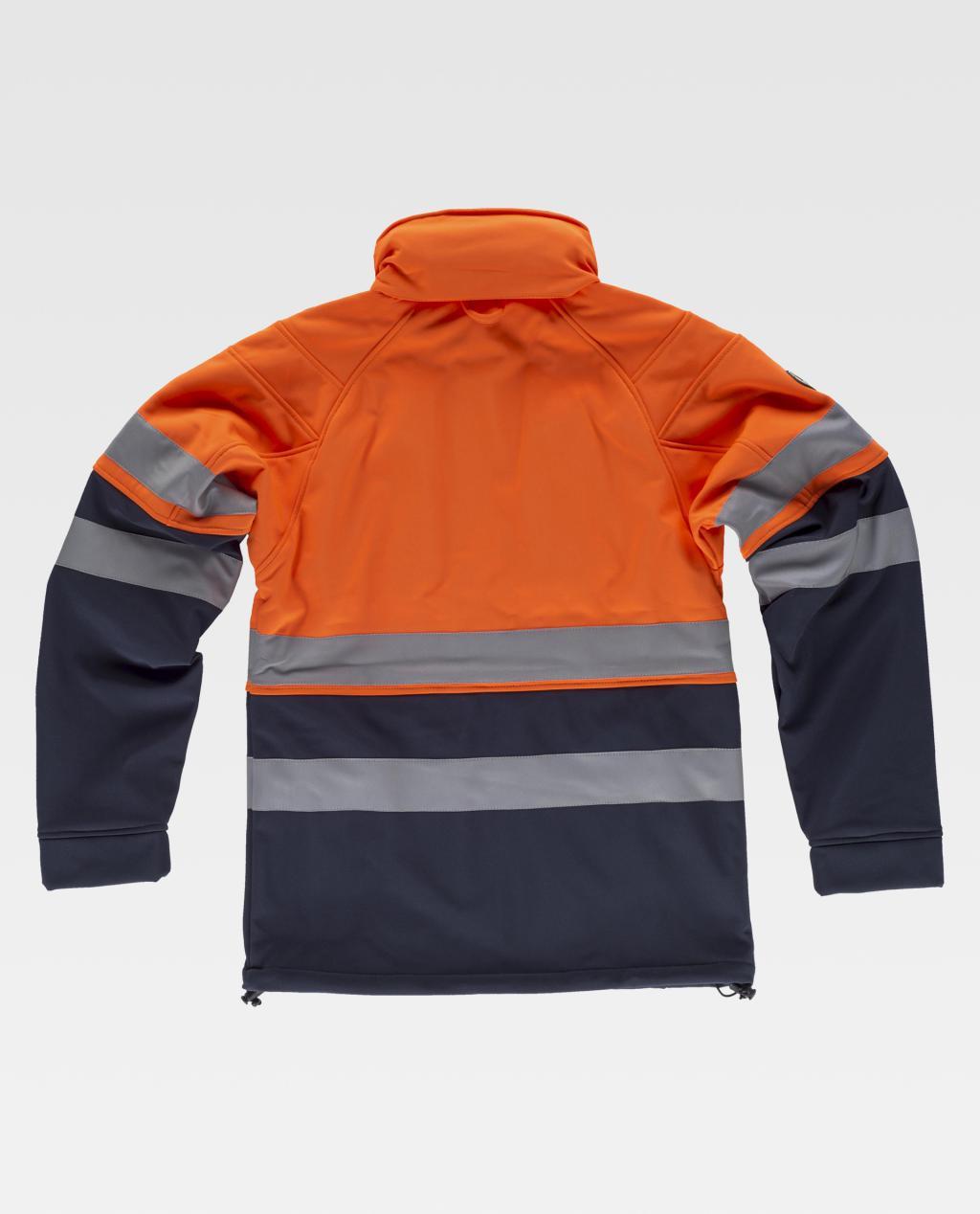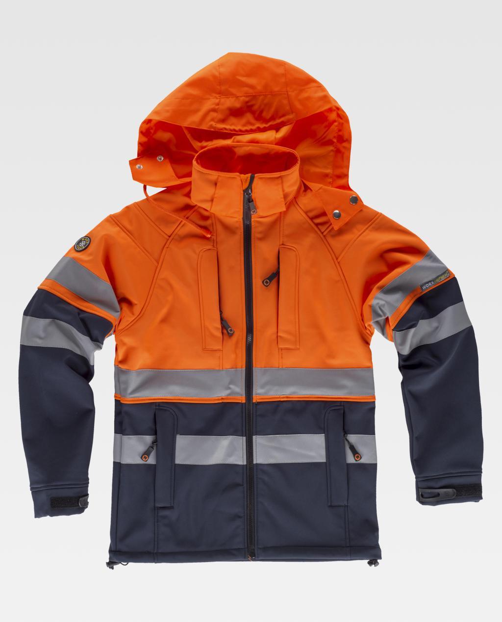 Casaco Workshell combinado com fitas refletoras. Parte superior de alta visibilidade. Gola alta e capuz desmontável com cordão para ajustar. Fecho de correr de náilon. Aba protetora interior com volta na parte superior protegendo o fecho de correr. Dois bolsos no peito e dois laterais interiores com fecho de correr de náilon. Duas fitas refletoras no peito, nas costas e nas mangas. Manga raglã e punhos ajustáveis com velcro. Cortes decorativos. Cordão elástico com peça ajustável no baixo. Tecido corta-ventos, repelente à água e resistente ao rasgo com membrana interior respirável e isolante no interior de alta capacidade térmica.