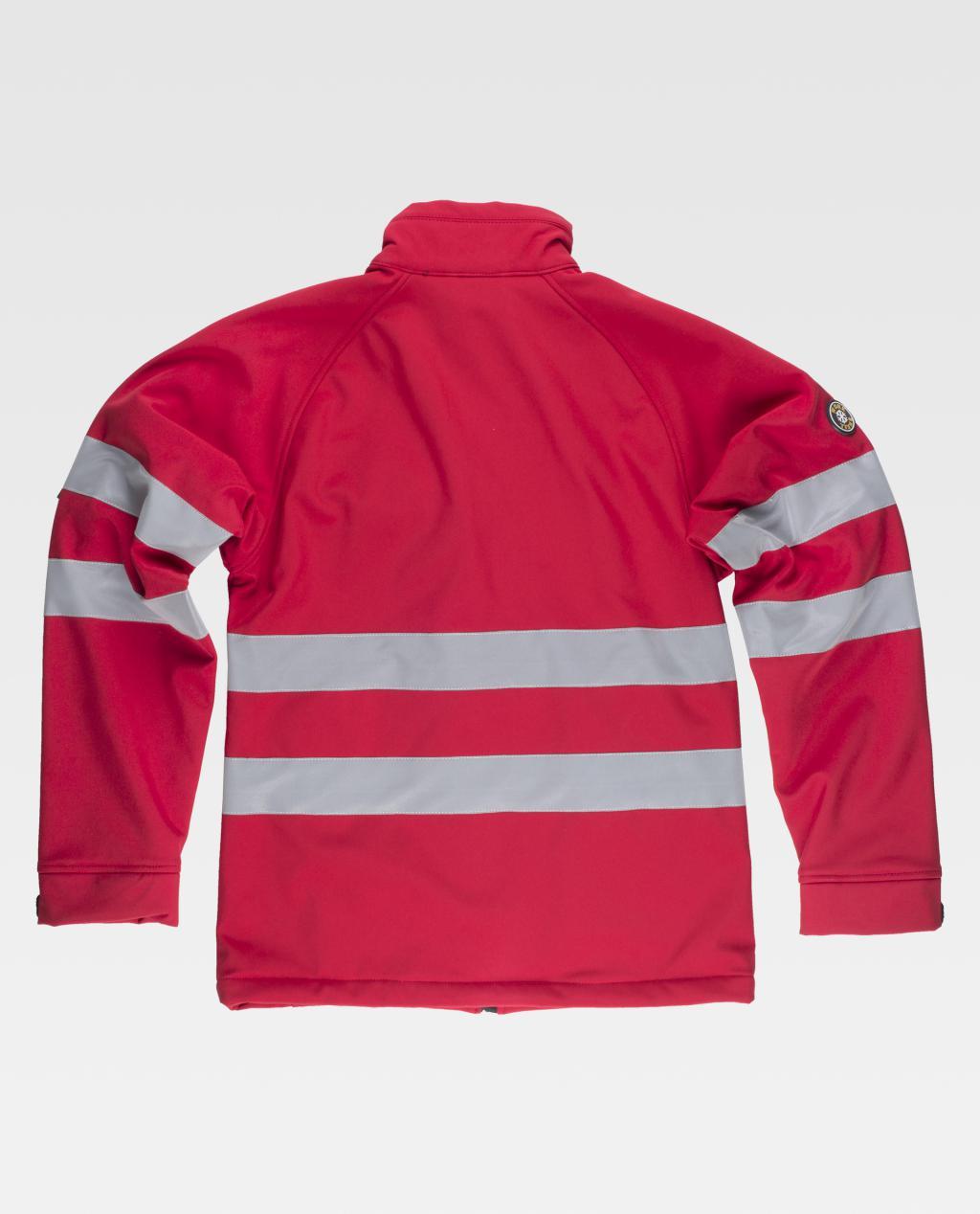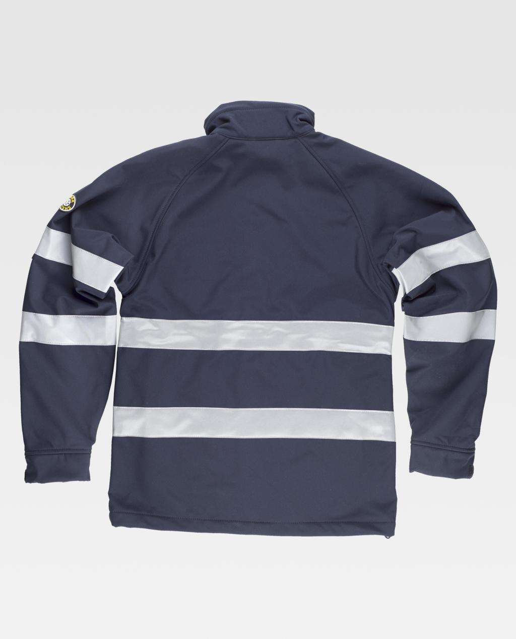 Blusão Workshell com fitas refletoras. Gola alta e fecho de correr de náilon. Aba protectora interior com volta na parte superior protegendo o fecho de correr. Um bolso no peito e dois laterais interiores com fecho de correr de náilon. Duas fitas refletoras no peito, nas costas e mangas. Manga raglã e punho ajustável com velcro. Cordão elástico com peça ajustável na cintura. Tecido corta vento, repelente de água e resistente ao rasgo com membrana interior transpirável, isolante e interior de alta capacidade térmica.